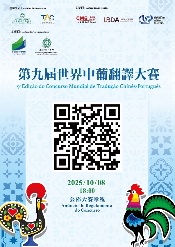 Por ocasião do 20.º aniversário do estabelecimento da Parceria Estratégica Global entre a China e Portugal, e com o objectivo de desenvolver ainda mais o papel de Macau como uma plataforma importante para o “interlocutor com precisão” entre a China e os Países de Língua Portuguesa, a 9.ª Edição do Concurso Mundial de Tradução Chinês-Português, organizado conjuntamente pela Direcção dos Serviços de Educação e de Desenvolvimento da Juventude (DSEDJ) do Governo da Região Administrativa Especial de Macau (RAEM) e pela Universidade Politécnica de Macau (UPM), será inaugurada oficialmente no dia 8 de Outubro de 2025.