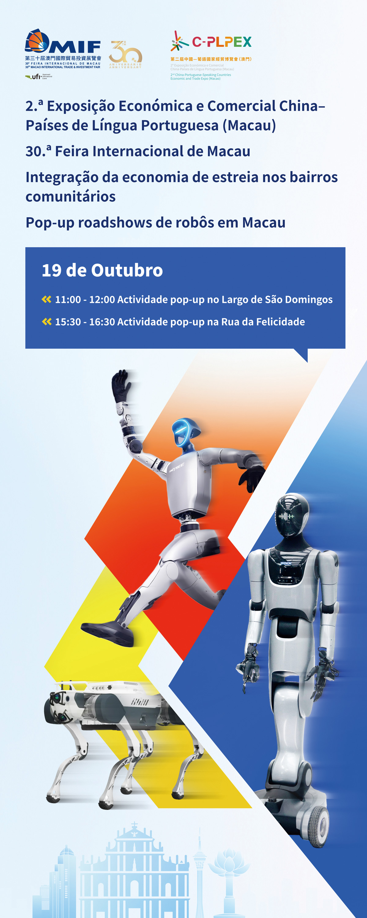 Além disso, a organização preparará, no dia 19 de Outubro, a estreia de robôs em Macau com pop-ups em bairros comunitários, como o Largo da Igreja de S. Domingos e a Rua da Felicidade, distribuindo presentes a residentes e turistas, interagindo e tirando fotografias com o público. O objectivo é promover, com antecedência, os Três Eventos e assinalar o 30.º aniversário da Feira Internacional de Macau. O público é bem-vindo a participar, no local.