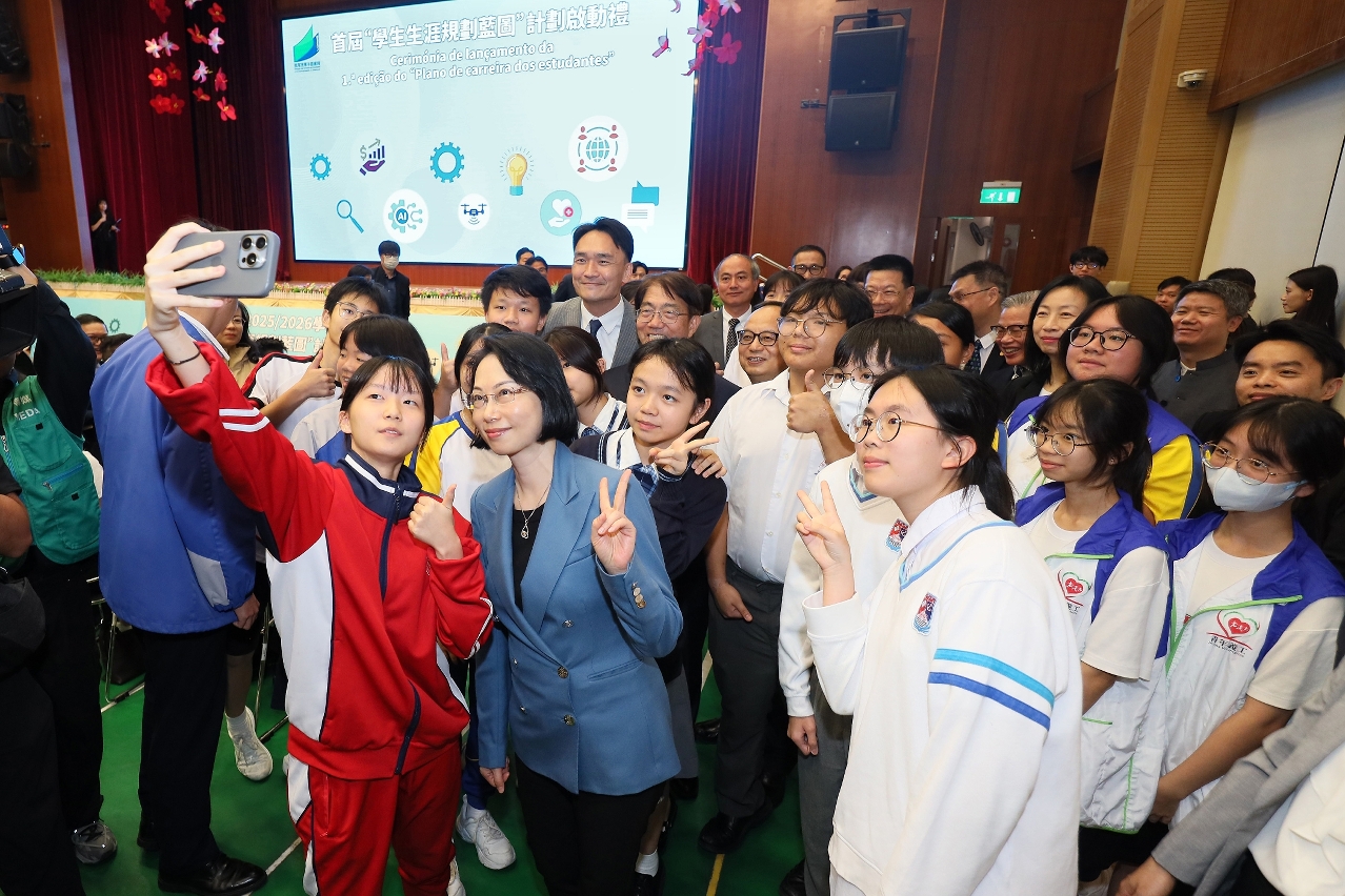 A cerimónia de lançamento da 1.ª edição do “Plano de carreira dos estudantes” para o ano lectivo de 2025/2026 foi realizada no dia 21 de Outubro, na Escola Keang Peng (Secção Primária). Na cerimónia, estiveram presentes a secretária para os Assuntos Sociais e Cultura, O Lam, o director da DSEDJ, Kong Chi Meng, o reitor da Universidade de Macau, Song Yonghua, a reitora da Universidade de Turismo de Macau, Vong Chuk Kwan, o reitor da Universidade de Ciência e Tecnologia de Macau, Lee Hun Wei Joseph, o presidente do Instituto Milénio de Macau, Zhong Weihe, o vice-reitor, substituto, da Universidade Politécnica de Macau, Ng San Fan, a chefe do Departamento da Escola Superior das Forças de Segurança de Macau, Lau Hang Yi Clara, o presidente da Direcção da Associação de Educação de Macau, Cheang Kit Chio, o vice-presidente executivo da Associação para a Promoção do Desenvolvimento do Ensino Superior de Macau, Mok Kai Meng, o vice-presidente da Direcção da Associação das Escolas Católicas de Macau, Chen Xinwang, o presidente da Associação Educativa da Função Pública de Macau, Lao Man Io, o presidente da Associação Promotora da Instrução Pós-Secundária de Macau, Chu Santos Vai Kun, a presidente da Associação de Nova Juventude Chinesa de Macau, Leong Sin Man, a presidente da Associação Geral de Estudantes Chong Wa de Macau, Un Su Kei, os dirigentes e chefia da DSEDJ, os membros do Conselho de Educação e do Conselho de Juventude, bem como os directores e representantes de instituições de ensino superior e de escolas secundárias de Macau.