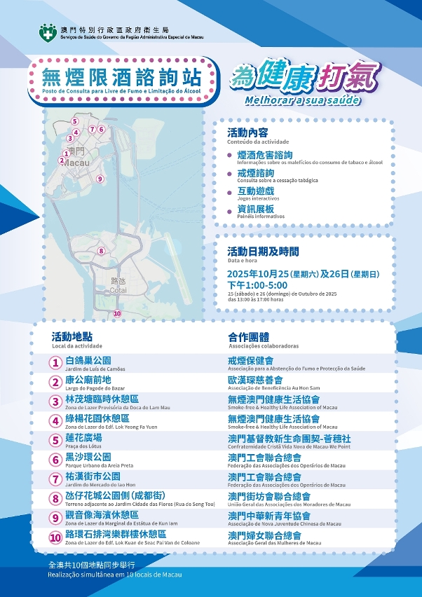 A actividade será realizada em 10 locais situados em Macau, Taipa e Coloane, onde serão instalados Postos de Consulta para Livre de Fumo e Limitação do Álcool, que proporcionarão informações sobre os malefícios do consumo de tabaco e álcool, consulta sobre a cessação tabágica, jogos interactivos e painéis informativos, de modo a transmitir ao público as informações sobre os malefícios do tabaco e álcool, bem como as disposições da «Lei de Controlo do Tabagismo» e da «Lei de Controlo do Álcool».