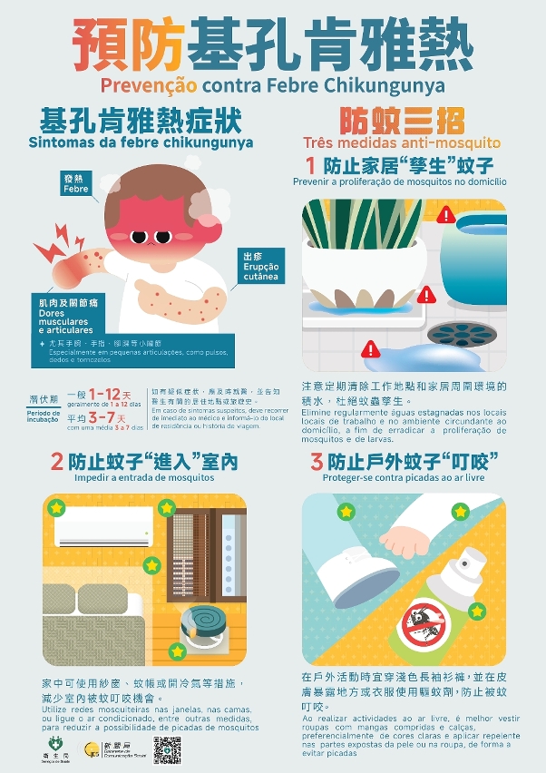 Em caso de apresentarem sintomas de febre, dores articulares e erupções cutâneas, os residentes devem recorrer de imediato ao médico e informá-lo do local de residência ou história de viagem. Os médicos devem proceder atempadamente ao teste aos doentes suspeitos de febre Chikungunya e à notificação. O Laboratório de Saúde Pública dos Serviços de Saúde proporciona o teste de febre Chikungunya. Para mais informações, os residentes podem ligar para a linha de doenças transmissíveis dos Serviços de Saúde n.º 28700800 ou consultar as informações sobre doenças transmissíveis na página electrónica dos Serviços de Saúde (https://www.ssm.gov.mo/csr).