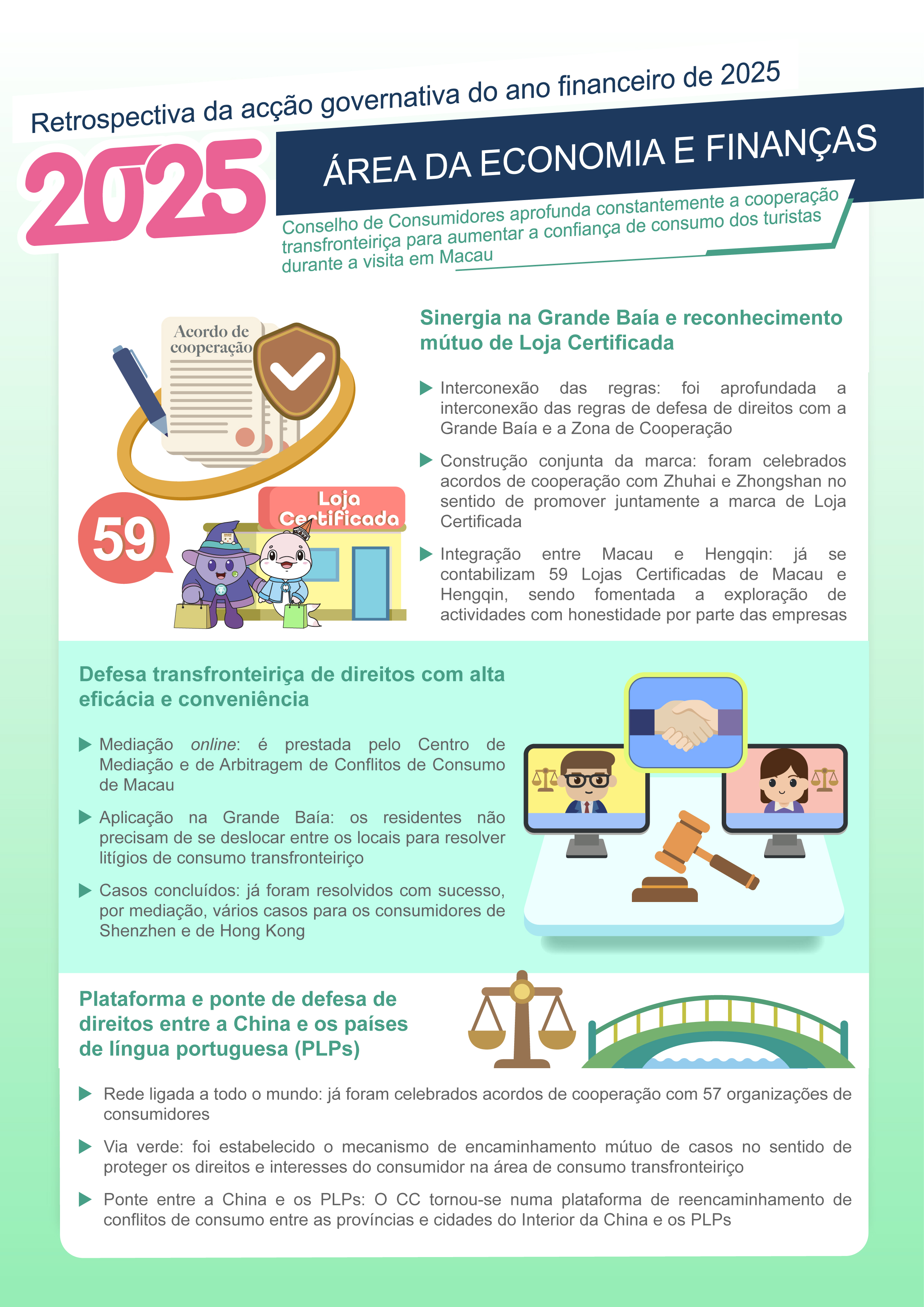 O CC e as organizações de consumidores das cidades integrantes da Grande Baía e da Zona de Cooperação estabeleceram um mecanismo de cooperação de mediação e arbitragem transfronteiriça online, com os serviços prestados pelo Centro de Mediação e de Arbitragem de Conflitos de Consumo de Macau. Esta iniciativa permite aos residentes da Grande Baía que, quando se envolverem em litígio durante a estadia em Macau, participem na mediação ou arbitragem por videoconferência no seu local de residência, sem precisar de se deslocar entre os dois locais, de maneira a resolver o litígio ocorrido em Macau por um curto período de tempo. Por outro lado, os residentes de Macau que encontrarem litígios de consumo na Grande Baía também podem recorrer ao mecanismo de mediação transfronteiriça para um tratamento conveniente e célere.