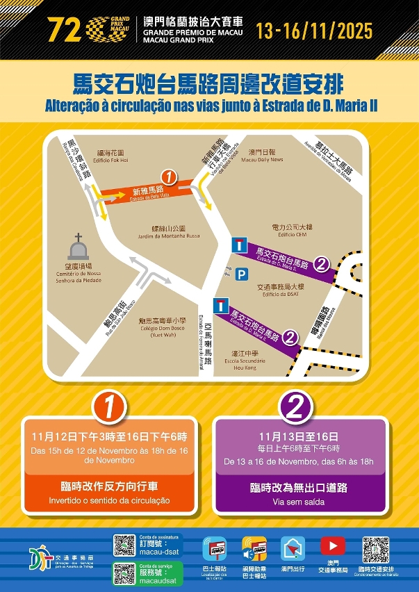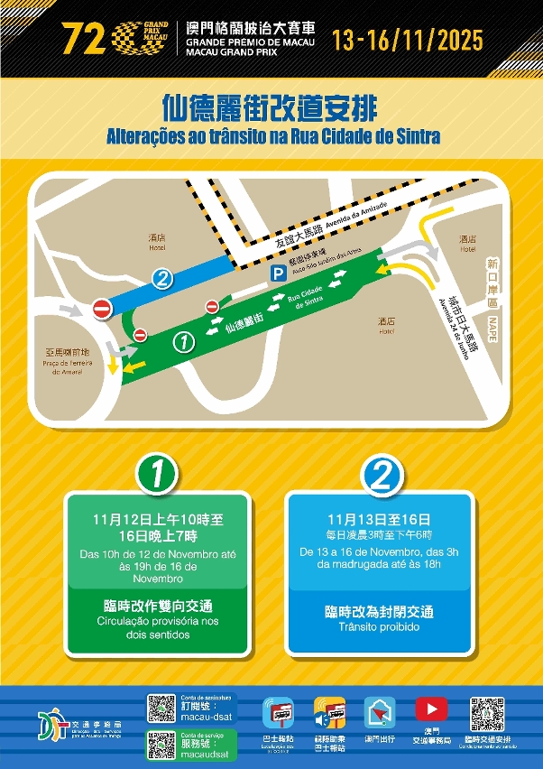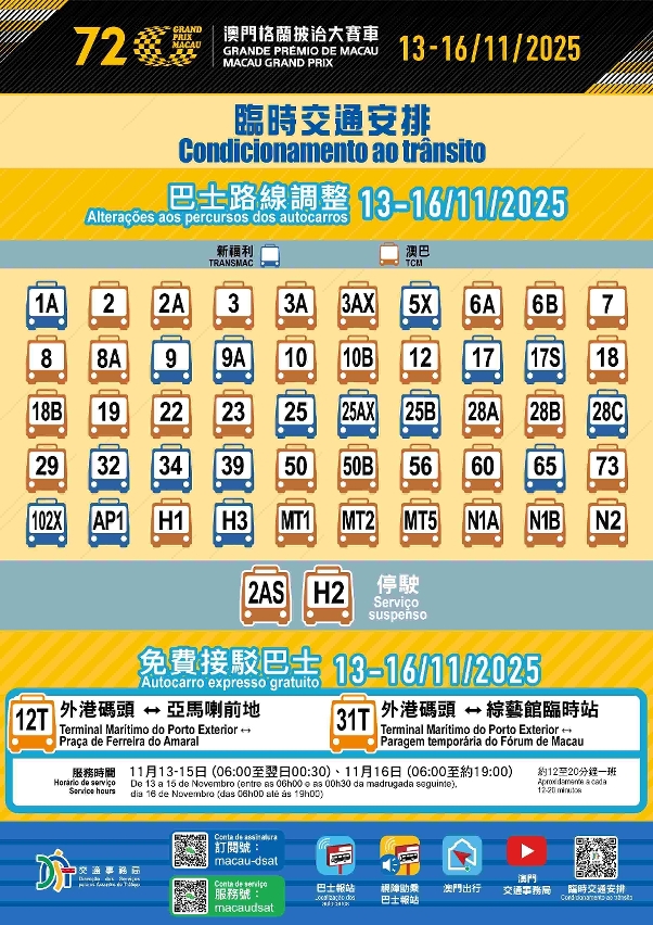 No âmbito da organização do 72.º Grande Prémio de Macau, a cargo do Instituto do Desporto, serão implementadas, de forma faseada, várias medidas provisórias de controlo de trânsito no circuito e nas vias adjacentes, entre os dias 12 (quarta-feira) e 16 (domingo) de Novembro. Entre 13 (quinta-feira) e 16 (domingo) de Novembro, um total de 52 carreiras de autocarros sofrerão ajustes temporários, estando disponíveis duas carreiras gratuitas. Para aliviar a pressão do trânsito na periferia do circuito, diversos serviços públicos, através da coordenação interdepartamental, procederam à abertura da rampa de acesso B e ao ajuste dos planos de execução de algumas obras viárias, com o objectivo de melhorar a capacidade de circulação. Para mais detalhes sobre as medidas provisórias de trânsito e os ajustes nas carreiras de autocarros, consulte a página dedicada da Direcção dos Serviços de Assuntos de Tráfego (DSAT): https://www.dsat.gov.mo/dsat/subpage.aspx?a_id=1761559294.