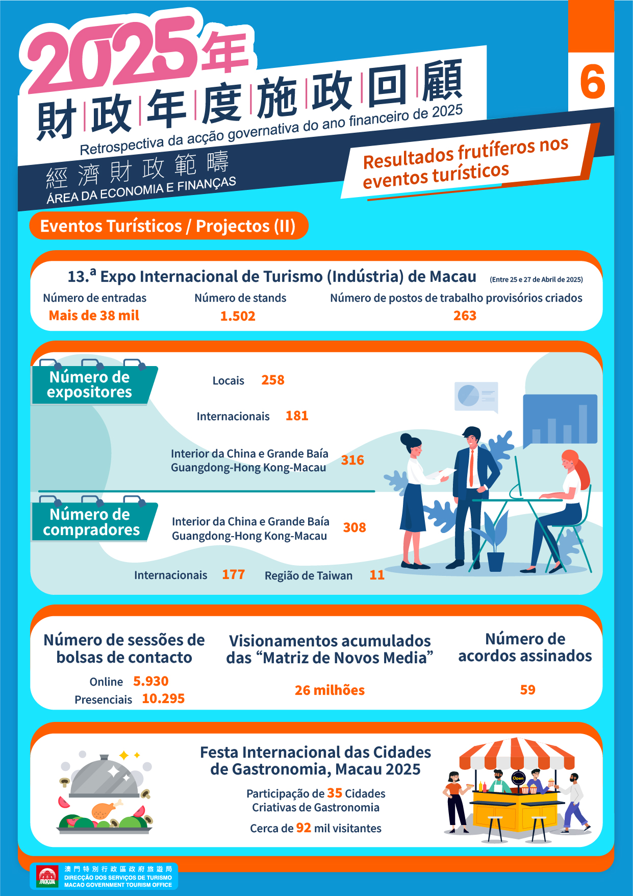 • “Turismo + Convenções e Exposições”: Em Abril, realizou-se a 13.ª Expo Internacional de Turismo (Indústria) de Macau, que contou com a participação de 70 países e regiões, com 1.502 stands instalados, apresentando um recorde histórico. Foram registadas perto de 38 mil entradas, realizadas mais de 16 mil sessões de bolsas de contacto, tendo o evento contribuído para a assinatura de 59 protocolos de cooperação.