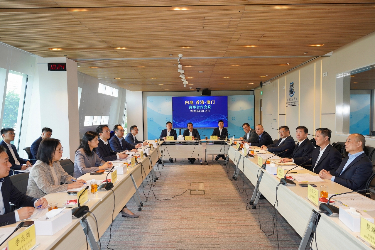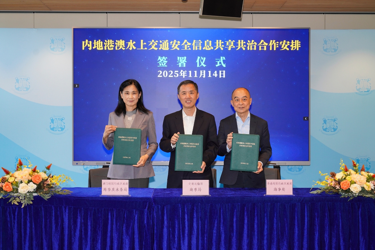 Com vista a garantir a segurança do tráfego marítimo na Grande Baía, a Administração de Segurança Marítima do Ministério dos Transportes, o Departamento Marítimo de Hong Kong e a Direcção dos Serviços de Assuntos Marítimos e de Água de Macau realizaram hoje (dia 14) em Macau a “Reunião de Cooperação Marítima entre o Interior da China, Hong Kong e Macau” e a “Reunião de Trabalho de Segurança Marítima entre Hong Kong e Macau”, e foi também realizada a cerimónia de assinatura do “Acordo de Cooperação sobre partilha e gestão conjunta das informações sobre segurança do tráfego marítimo entre o Interior da China, Hong Kong e Macau”, no sentido de reforçar a comunicação mútua de informações sobre segurança do tráfego marítimo, elevar a eficácia da gestão marítima e desenvolver um sistema de segurança marítima de melhor qualidade para a Grande Baía.