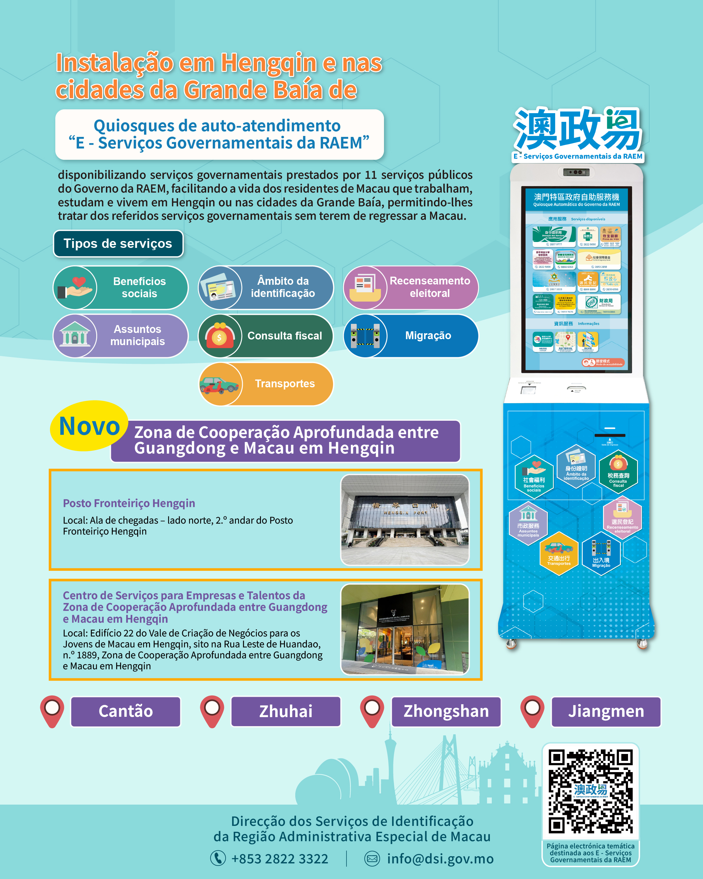 Os quiosques de auto-atendimento “E - Serviços Governamentais da RAEM” disponibilizam um total de 37 serviços governamentais que são mais procurados pelos residentes de Macau, prestados por 11 entidades públicas, em sete categorias, nomeadamente nas áreas de benefícios sociais, identificação, consulta fiscal, assuntos municipais, recenseamento eleitoral, transportes e migração, a fim de facilitar a vida dos residentes de Macau que trabalham e vivem na Zona de Cooperação Aprofundada, permitindo-lhes tratar dos serviços necessários sem terem de regressar a Macau, contribuindo assim para a criação de um ambiente habitável semelhante entre Macau e Hengqin. Os “E - Serviços Governamentais da RAEM” serão instalados no lado norte do átrio de chegadas do segundo andar do Posto Fronteiriço Hengqin, bem como no Centro de Serviços para Empresas e Quadros Qualificados da Zona de Cooperação Aprofundada entre Guangdong e Macau em Hengqin (endereço: Edifício n.º 22 do Vale de Criação de Negócios para os Jovens de Macau em Hengqin, sito na Rua Huan Dao Tong Lu, n.º 1889, Zona de Cooperação Aprofundada entre Guangdong e Macau em Hengqin). Além disso, em Junho do corrente ano, os referidos quiosques de auto-atendimento já se encontram instalados em quatro cidades da Grande Baía: Cantão, Zhuhai, Zhongshan e Jiangmen. Para mais informações sobre os quiosques de auto-atendimento “E - Serviços Governamentais da RAEM”, consulte a página electrónica temática: https://www.dsi.gov.mo/mo-eservice/.