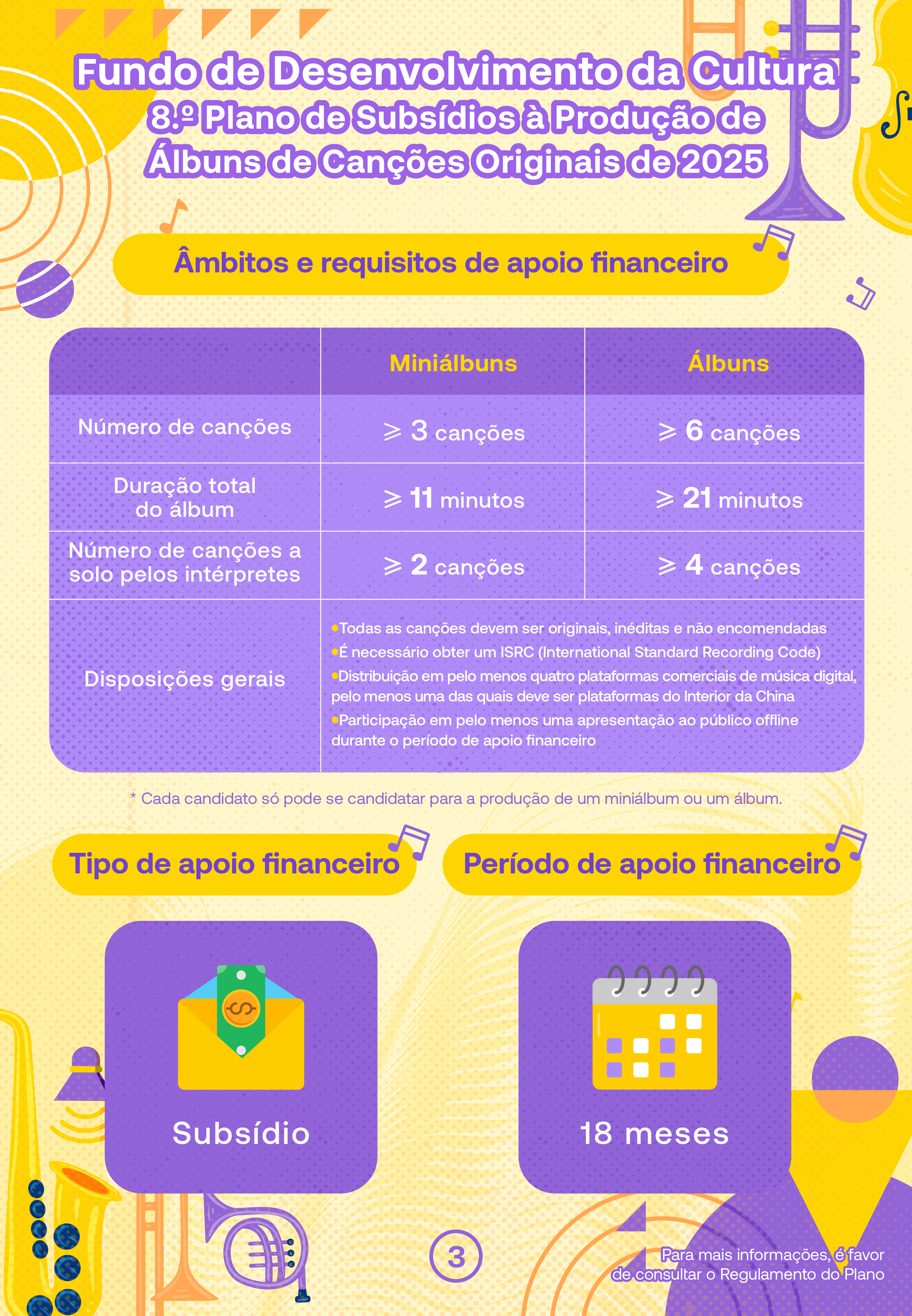 O período de candidatura decorrerá de 31 de Dezembro de 2025 a 13 de Fevereiro de 2026. Os álbuns a subsidiar são de dois tipos, nomeadamente, “miniálbuns” e “álbuns”, excluindo as colectâneas musicais e os álbuns de grandes êxitos. Todas as canções devem ser obras originais, inéditas e não encomendadas, com um mínimo de 3 canções para “miniálbuns” e um mínimo de 6 canções para “álbuns”. Os álbuns financiados devem ser distribuídos digitalmente em pelo menos 4 plataformas comerciais de música digital, pelo menos uma das quais deve ser plataforma relevante do Interior da China, devendo os intérpretes participar em pelo menos um evento público offline e interpretar pelo menos uma canção do álbum financiado. Cada candidatura deve incluir apenas a produção de um miniálbum ou de um álbum.