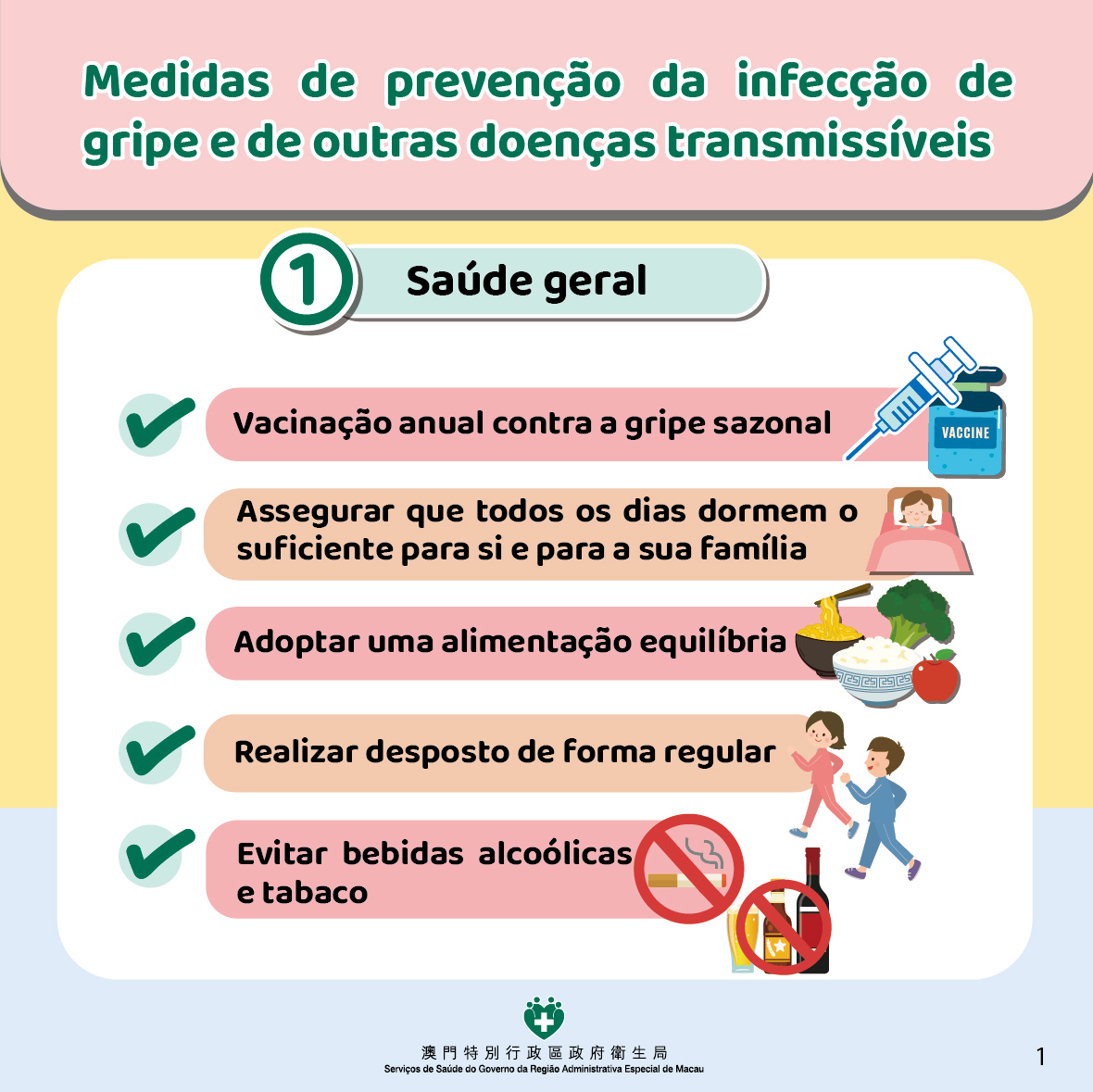 Para reduzir o risco de contrair a gripe e outras doenças infecciosas, os Serviços de Saúde recomendam que os residentes consultem as seguintes infografias para reforçar as medidas de protecção individual.