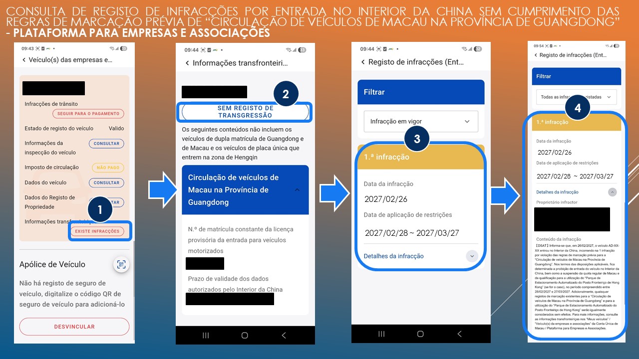 A Direcção de Serviços notificará o requerente (proprietário do veículo) e o condutor do veículo infractor através de SMS, mensagens de alerta na “Conta Única de Macau”, notificações push do sistema de “Circulação de veículos de Macau na Província de Guangdong”; as pessoas envolvidas podem igualmente consultar os registos relevantes na página de consulta do sistema de “Circulação de veículos de Macau na Província de Guangdong”, bem como nas informações do veículo transfronteiriço, da funcionalidade “Meus veículos” da “Conta Única de Macau” e da funcionalidade “Veículos de empresas e associações” da “Plataforma para Empresas e Associações”.