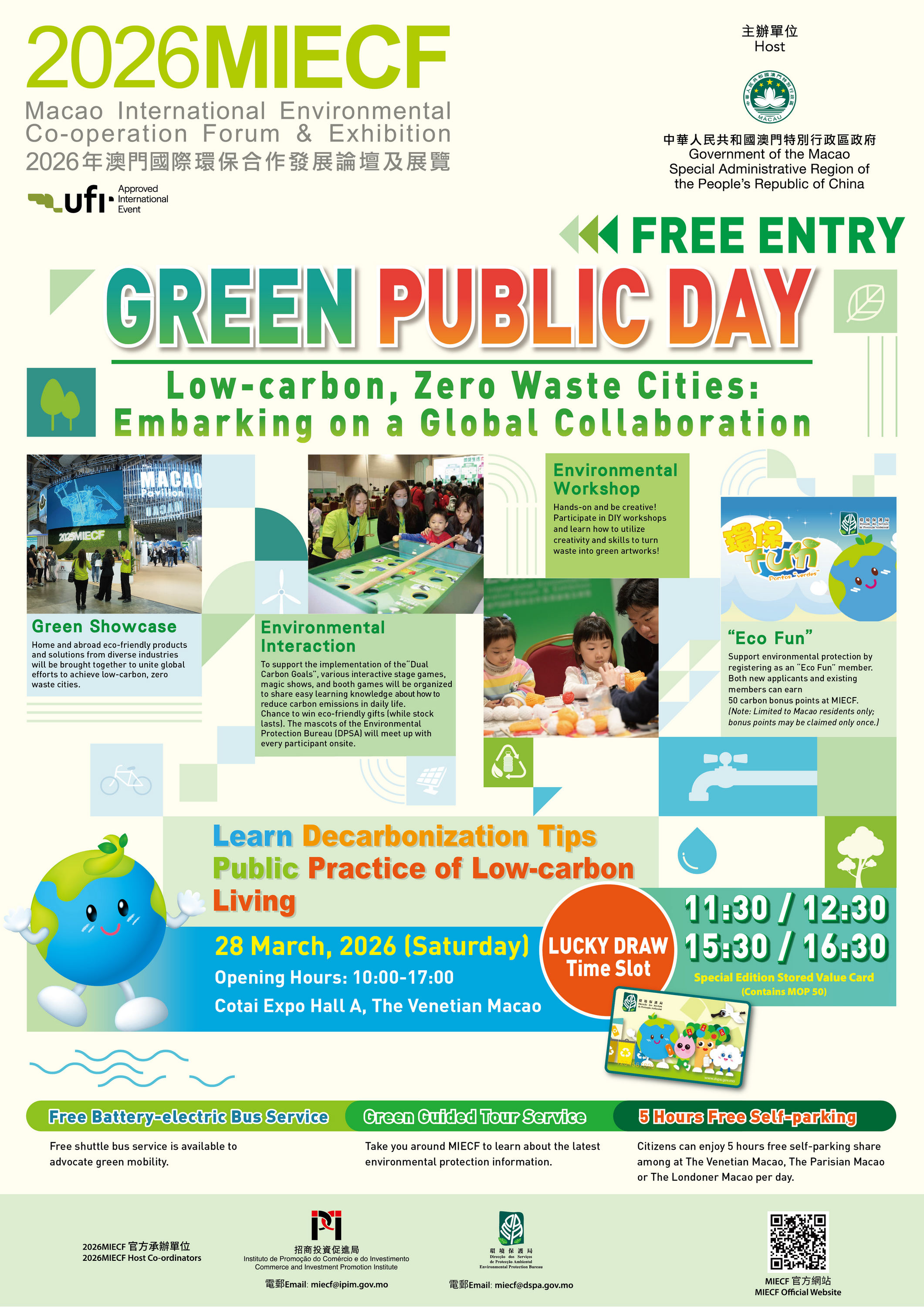 Subordinado ao tema “Cidades de Baixo Carbono e com Zero Resíduos: Embarcando numa Colaboração Global”, o Fórum e Exposição Internacional de Cooperação Ambiental de Macau 2026 (doravante designado por “2026MIECF”) dedica o último dia do evento, amanhã (28 de Março), ao “Dia Verde do Público”. Com entrada gratuita, o evento convida o público a participar numa série de actividades de educação e sensibilização sobre a protecção ambiental. Através da plataforma do MIECF, os visitantes terão a oportunidade de conhecer as informações mais recentes sobre a protecção ambiental, promover a adopção de diversos estilos de vida verdes e de baixo carbono, contribuindo assim para a construção conjunta de cidades com zero resíduos.
