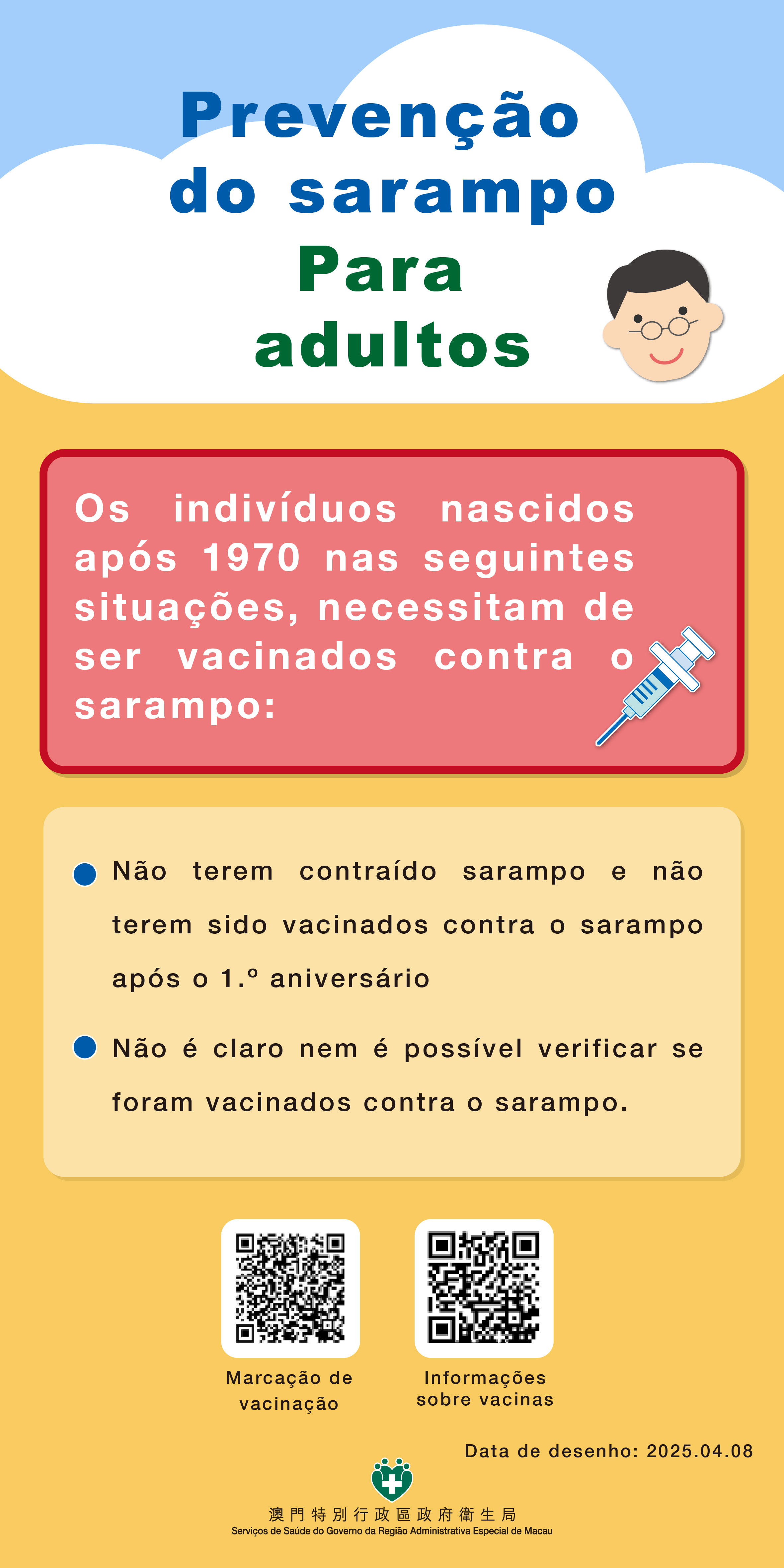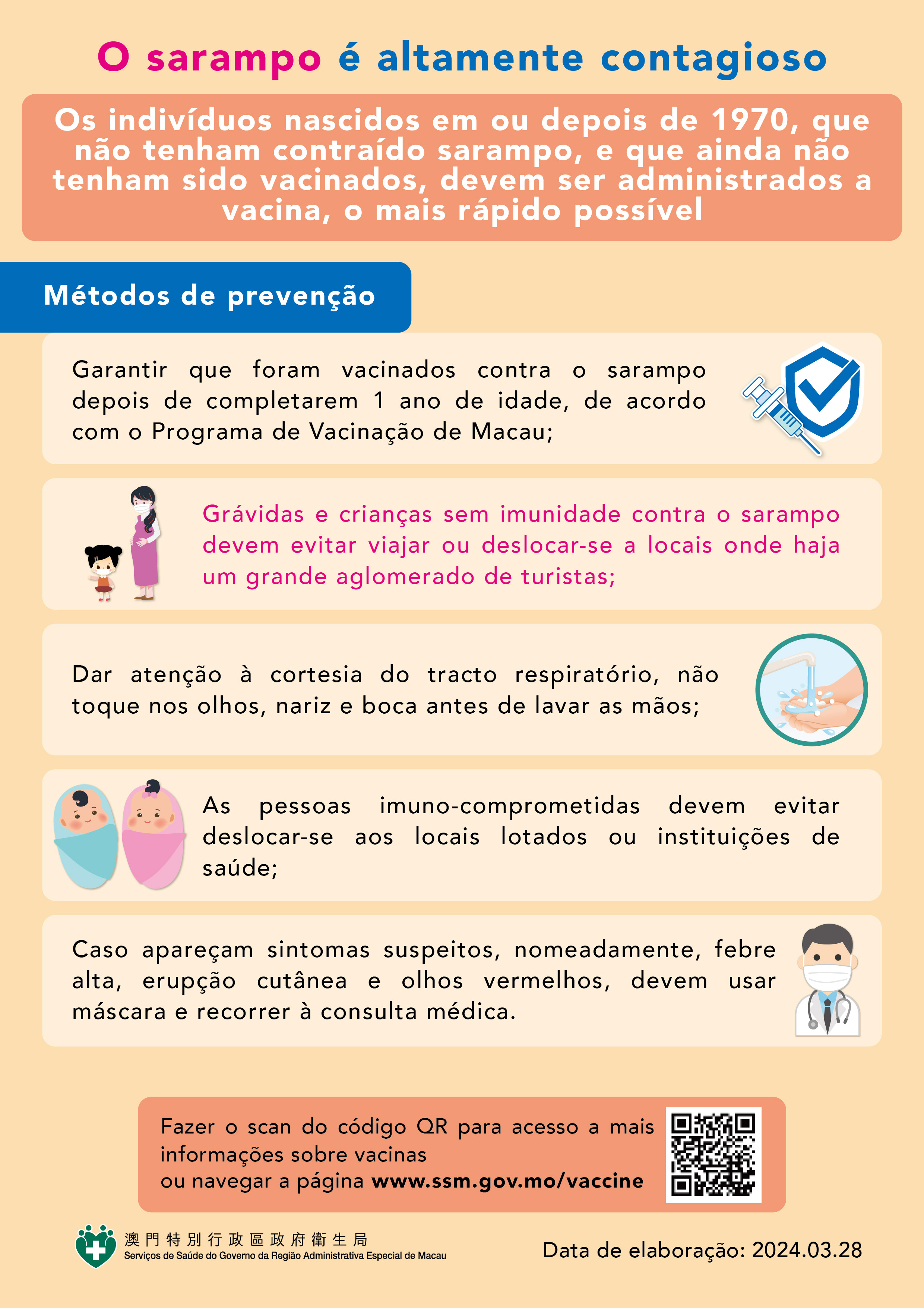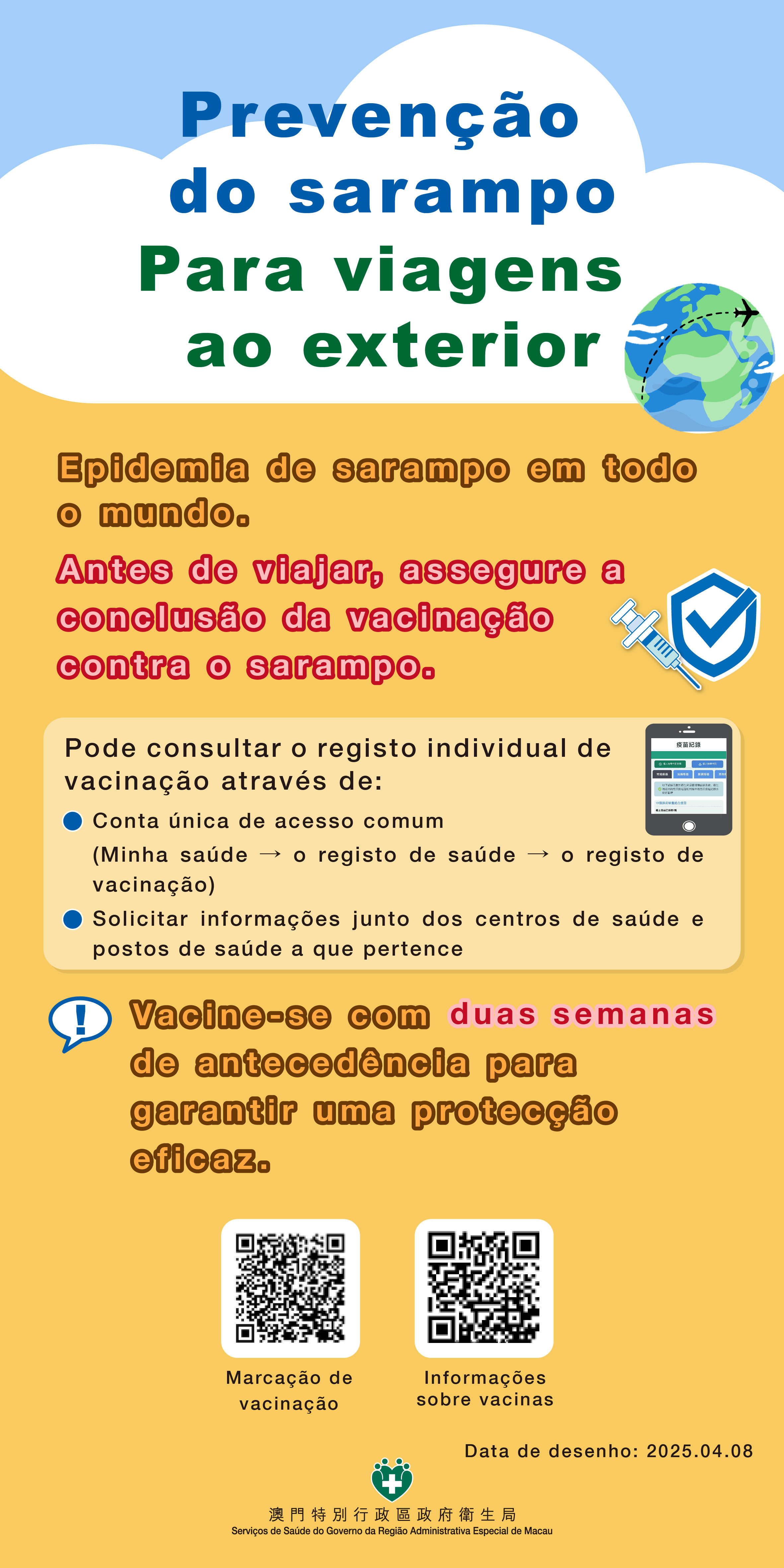 Recentemente, a situação epidemiológica do sarampo tem-se vindo a agravar em muitas partes do mundo, tendo sido registados casos no Japão, Indonésia, Filipinas, Europa e Estados Unidos da América. Entretanto, com a aproximação das férias da Páscoa e do Cheng Ming, prevê-se um elevado número de turistas em Macau, bem como de residentes a viajar para o exterior. Os Serviços de Saúde apelam os residentes para que tomem medidas preventivas contra o sarampo. As crianças com vacinação incompleta e as mulheres grávidas não imunizadas são consideradas grupos de alto risco e devem evitar as deslocações para as zonas onde o sarampo é prevalente, com o intuito de reduzir o risco de importação e transmissão desta doença em Macau.