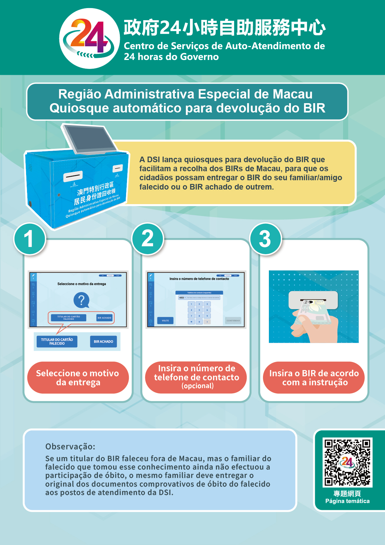 Para facilitar aos cidadãos a entrega do bilhete de identidade de residente (BIR) de Macau do seu familiar/amigo falecido ou do BIR de Macau achado, a Direcção dos Serviços de Identificação (DSI) lança, em 27 de Abril de 2026, os quiosques para devolução do BIR. Presentemente, os referidos quiosques encontram-se instalados nos Centros de Serviços de Auto-Atendimento de 24 horas do Governo na Praia Grande, em Venceslau de Morais e no Centro da Taipa, prestando um serviço conveniente de recolha do BIR 24 horas por dia.