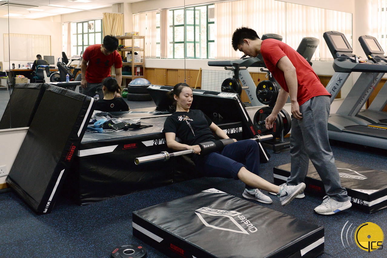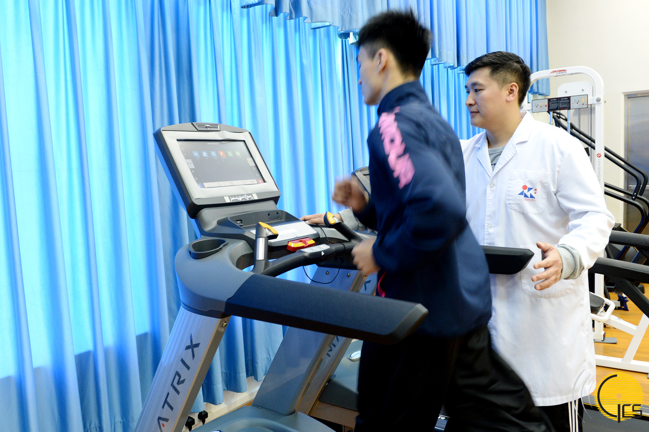 运动员在运动医学中心技术员指导下,利用各项健身器具进行康复运动。