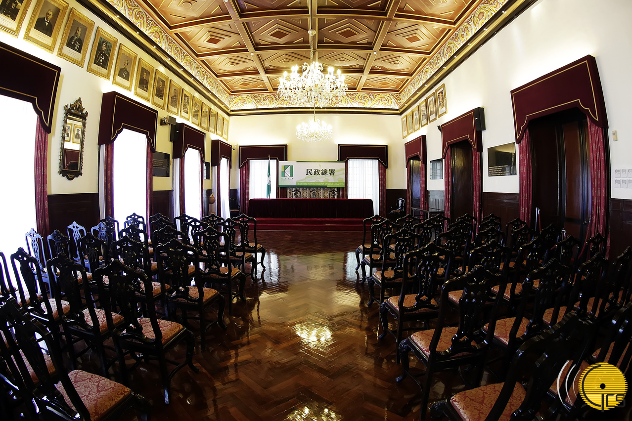 至于大礼堂则是民政总署举行隆重仪式及会议的地方。大礼堂空间宽敞,木制的护壁及天花工艺精巧,天花与墙壁交接处有手绘图案饰边。