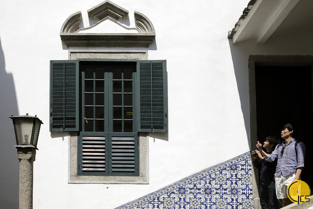 由大楼两侧一直延伸至后花园的墙面装饰,是来自葡萄牙的蓝白色瓷砖,配上夺目的鲜花,烘托出十八世纪葡萄牙庄园的氛围。