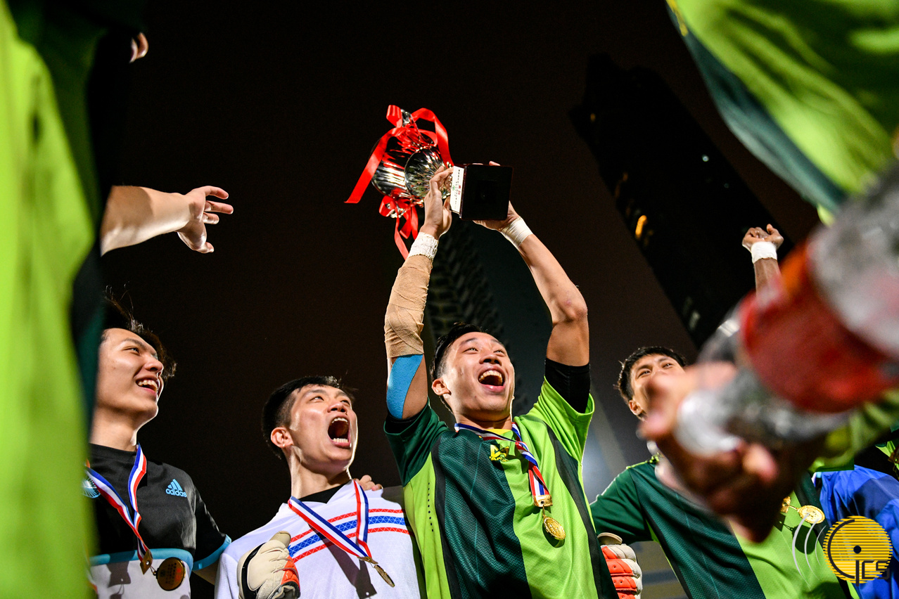 “2018澳门七人足球锦标赛”圆满落幕,赢得甲组冠军的队伍高举奖杯欢呼。