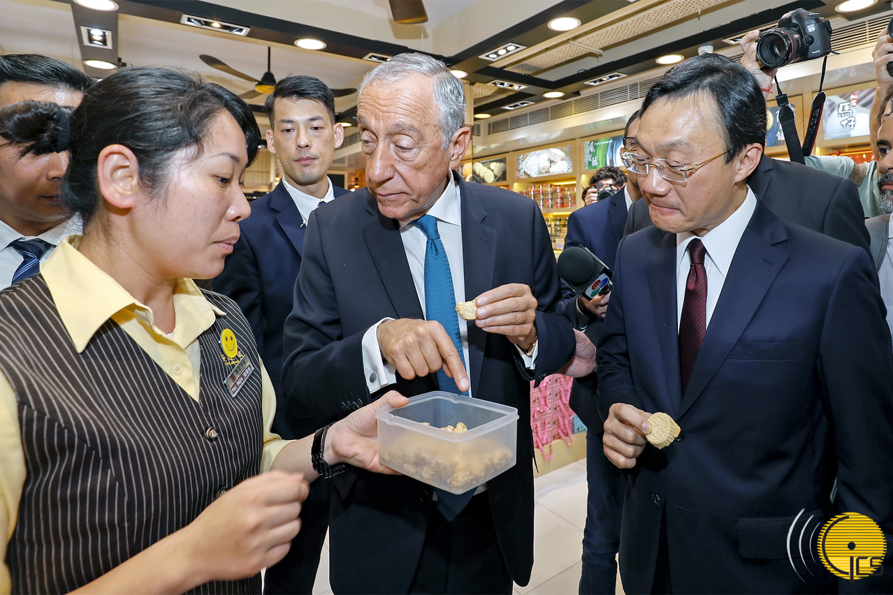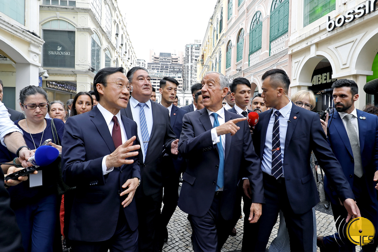 社会文化司司长谭俊荣陪同葡萄牙共和国总统马塞洛‧雷贝洛‧德索萨从议事亭前地步行至大三巴牌坊,沿途参观。