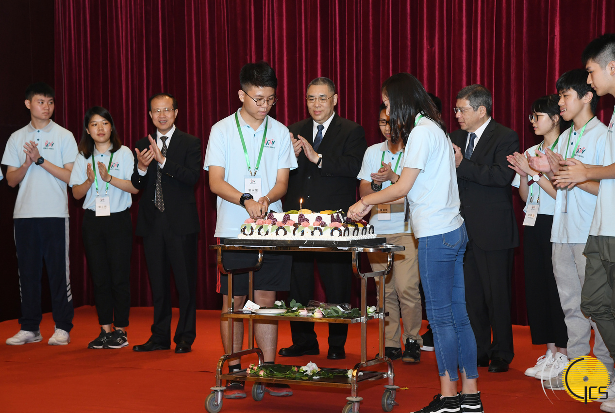 正在承德的行政长官崔世安与“新时代同心行”河北省学习参访团中七月生日的青少年切蛋糕庆祝