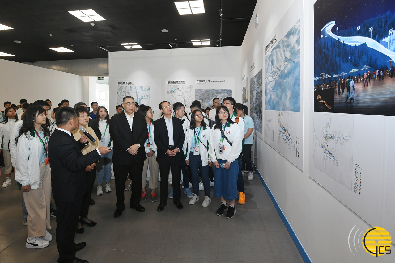 行政长官崔世安与“新时代同心行”河北省学习参访团在冬奥规划展馆内观看视频,了解2022冬奥张家口赛区的规划建设情况。