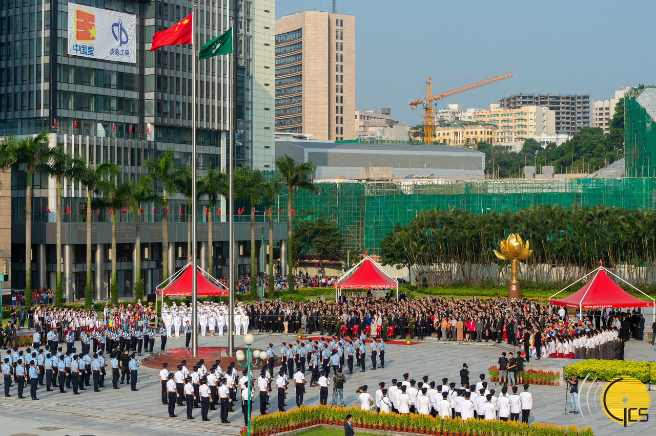 代理行政长官、特区官员、中央驻澳官员、解放军驻澳部队军官及各界人士出席庆祝中华人民共和国成立70周年升旗仪式。
