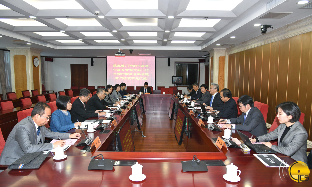 行政长官崔世安在北京拜访中国社会科学院,听取该院研究团队关于澳门回归祖国以来治理实践经验的专项课题研究汇报,并回顾了过去一段时间的合作成果。
