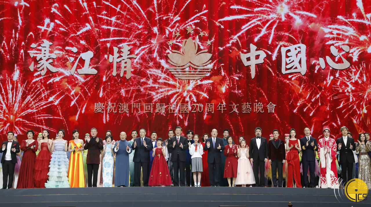 国家主席习近平在庆祝澳门回归祖国二十周年文艺晚会上与表演人士合唱《歌唱祖国》
