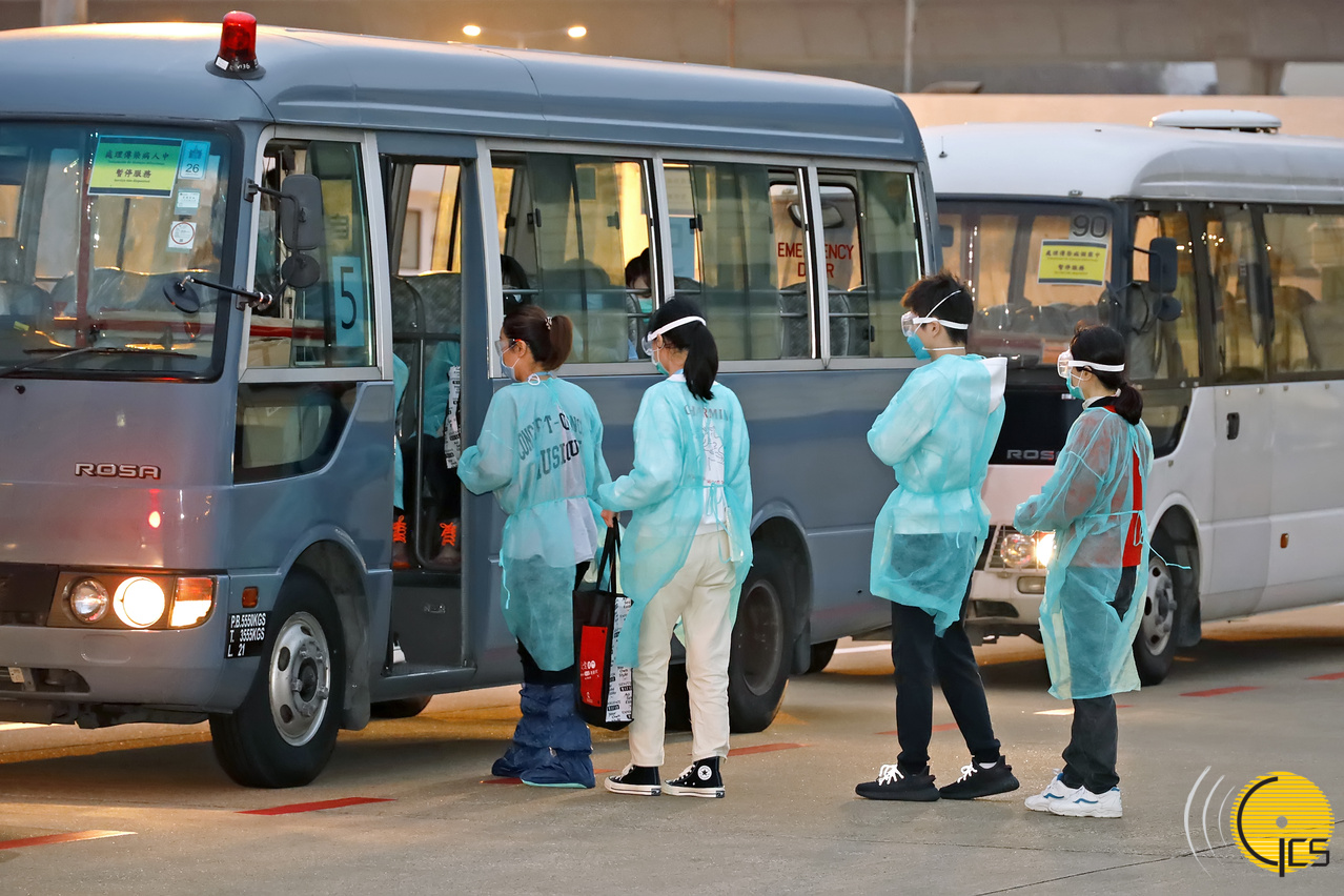 随专机赴鄂的工作人员,离开机舱登上特区政府安排的车辆,前往路环高顶公共卫生临床中心作清洗消毒,之后到皇庭海景酒店隔离14天。