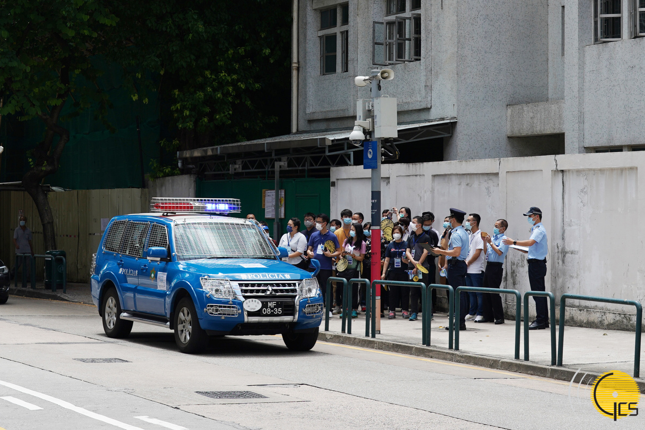 “水晶鱼2020”演习-治安警察局联同澳门建筑机械工程商会开展清障行动,清理倒塌于马路上的电灯柱。