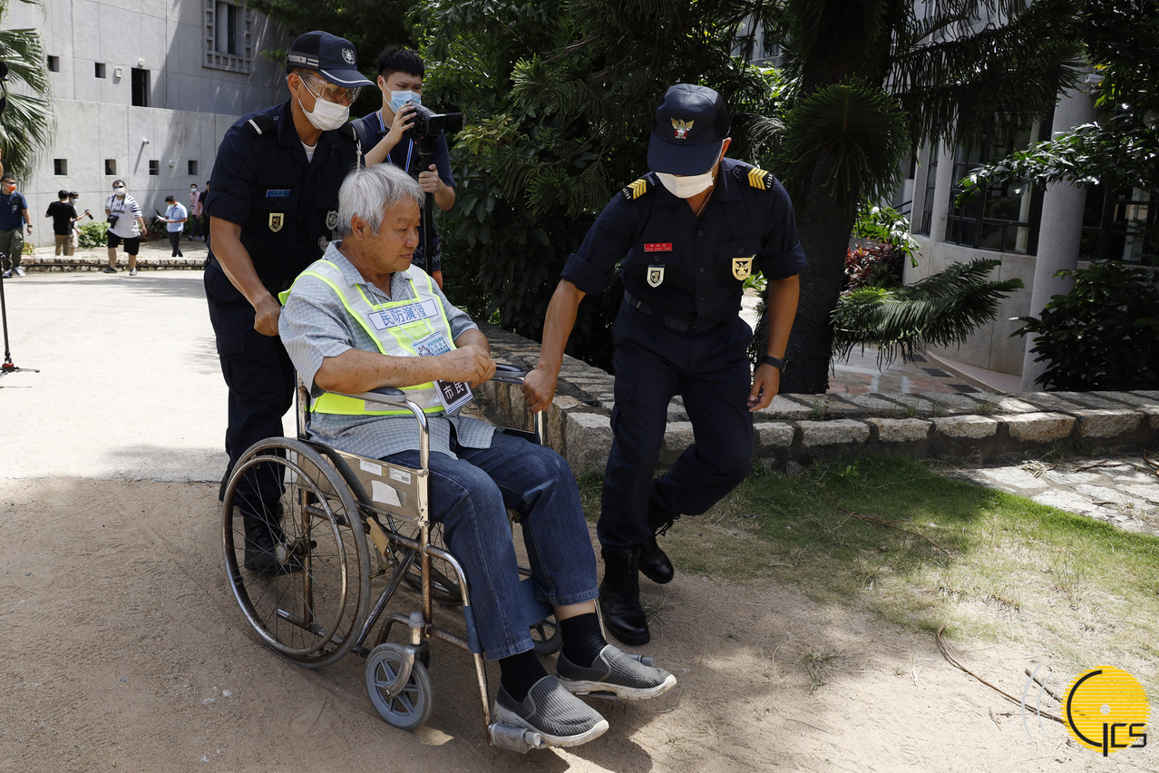 “水晶鱼2020”演习-工作人员协助使用轮椅人士撤离到避险中心。