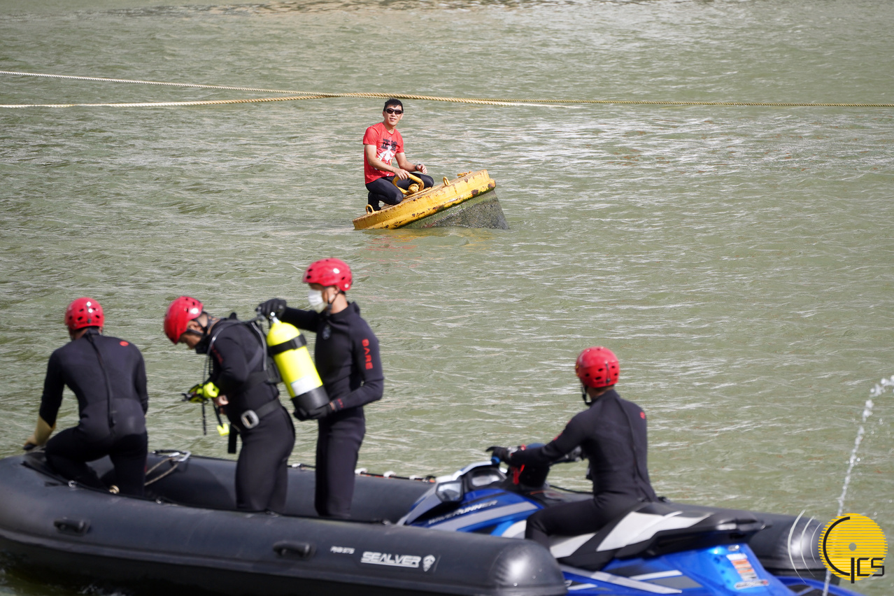 “水晶鱼2020”演习-海关就电箱漏电事故,出动水上电单车连专用橡皮艇进行救援。