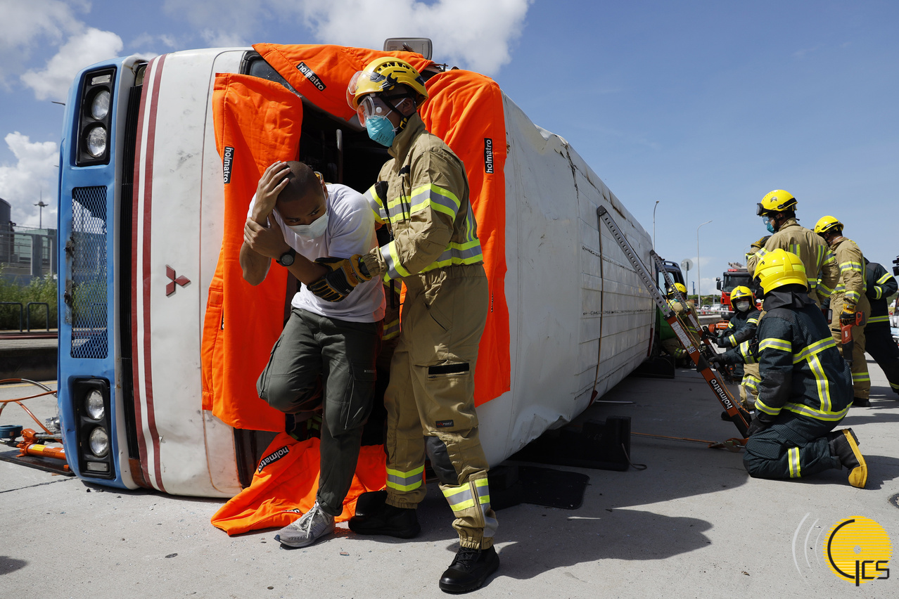“水晶鱼2020”演习-消防局联同澳门建筑机械工程商会就巴士翻侧交通意外,开展救援行动。