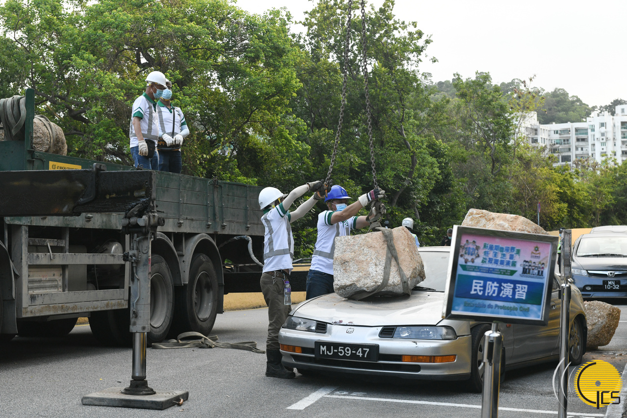 “水晶鱼2021”台风演习-治安警察局联同澳门建筑机械工程商会开展清障行动,清理路面。