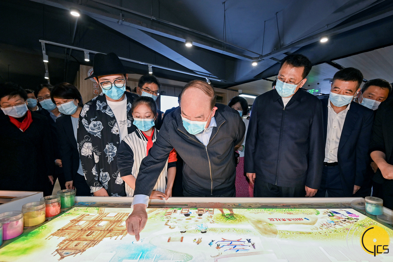 行政长官贺一诚一行考察滨江区缤纷未来社区,细心了解社区兴趣班学员的手工艺成品。