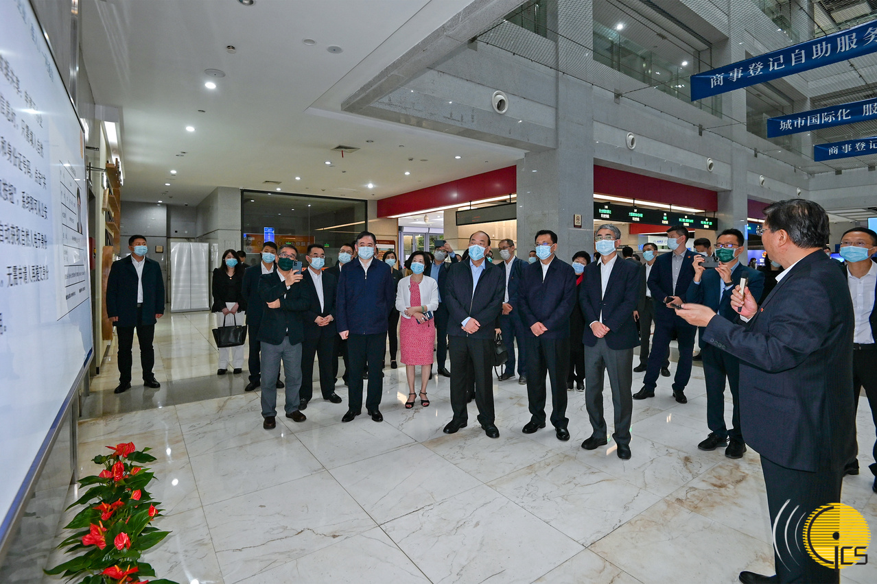 行政长官贺一诚一行参观杭州市民中心办事大厅,了解综合性政府服务平台的运作情况。