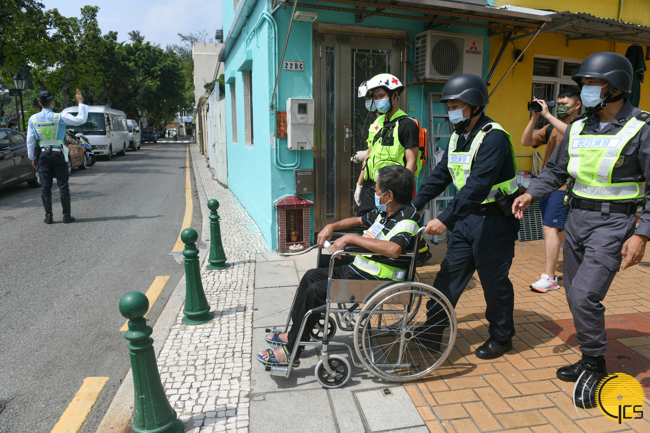 “水晶鱼2022”台风演习-保安部队高等学校人员协助行动不便人士疏散撤离。