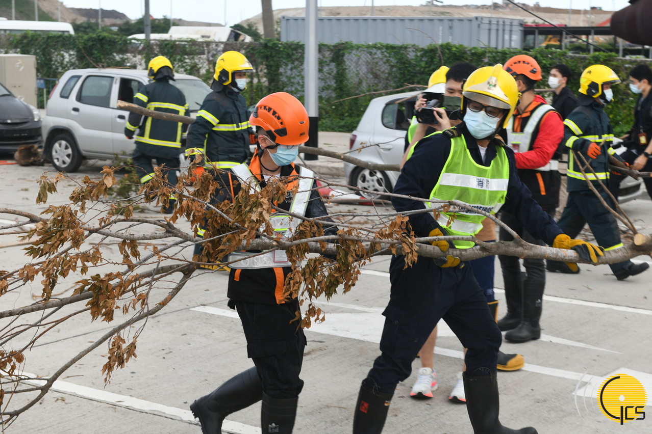 “水晶鱼2022”台风演习-民防志愿者参与道路清障工作。