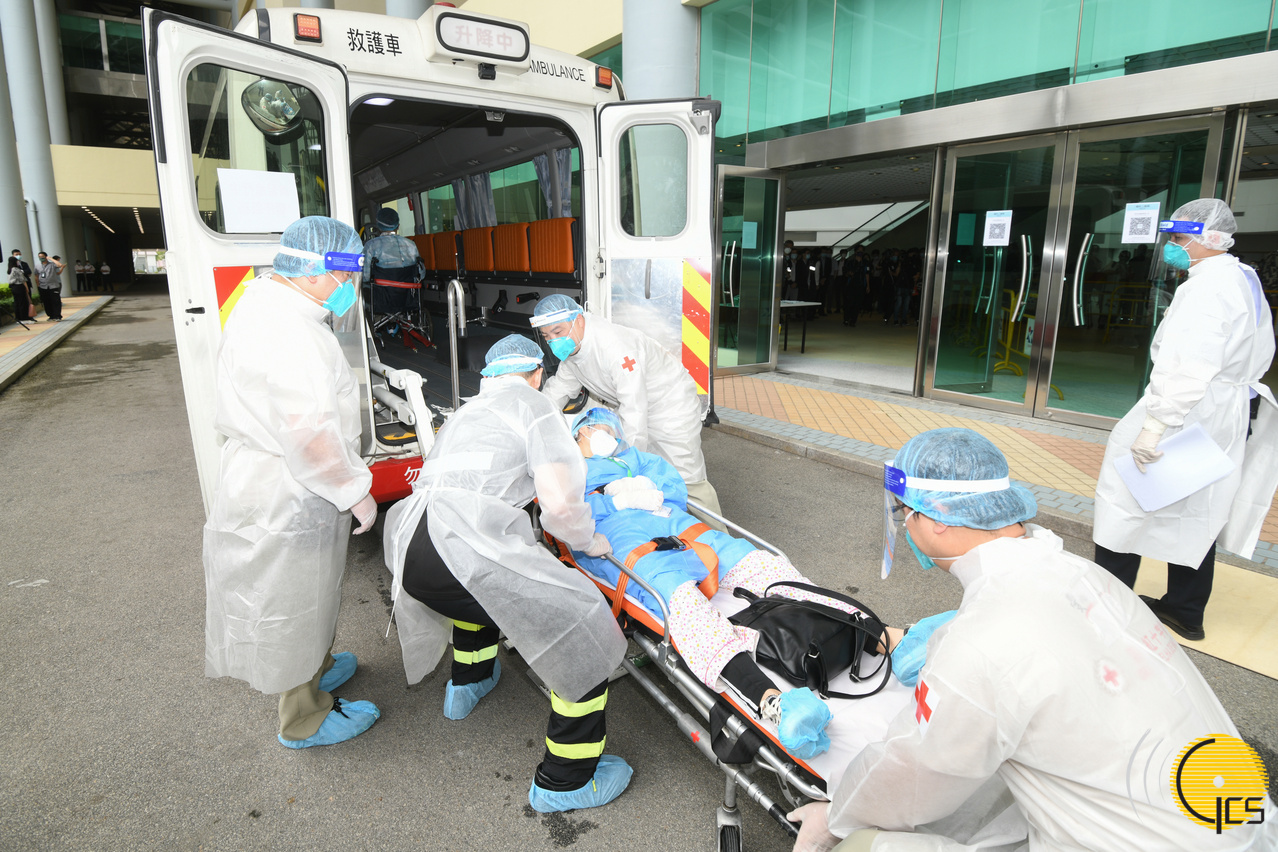 社区治疗中心第一次跨部门演练 - 红十字会接载确诊者到治疗中心住院部。