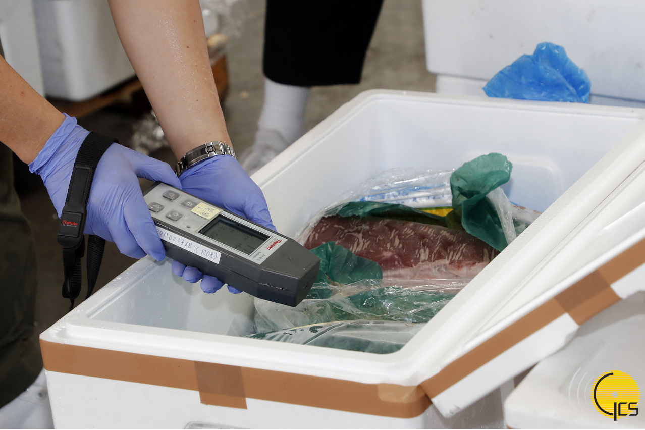 市政署派员在澳门国际机场使用辐射测量仪器检测每批从日本进口的鲜活食品
