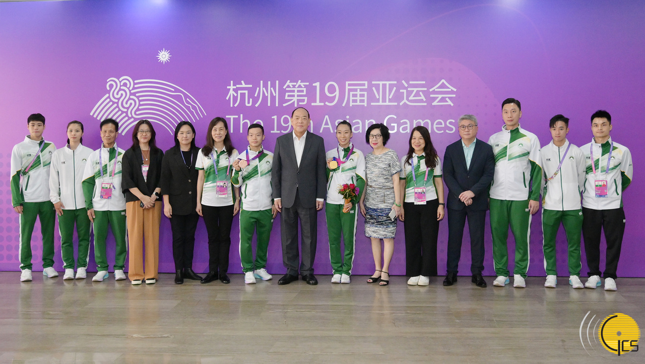 行政长官贺一诚一行与李祎、宋子君,以及一众参与本届亚运的澳门武术运动员和教练团合影。