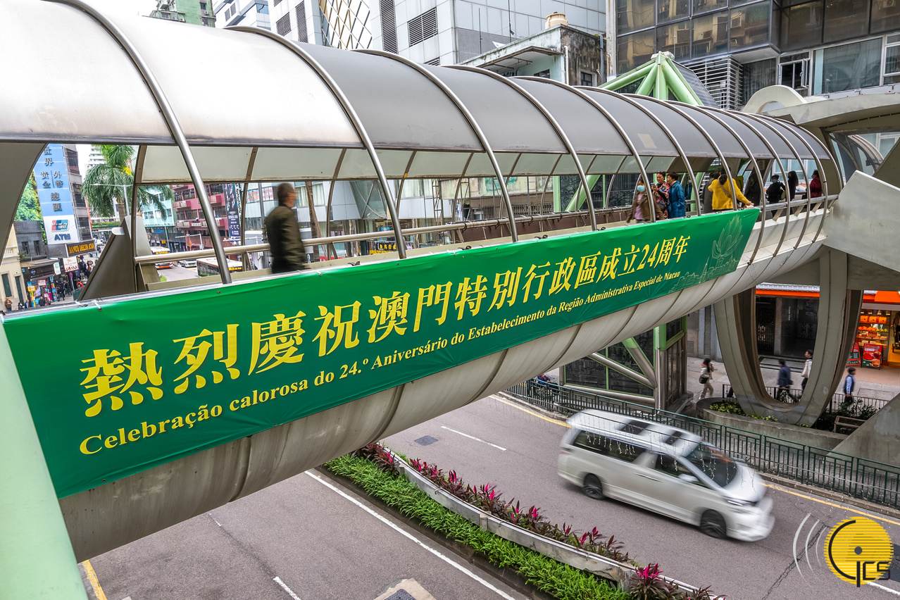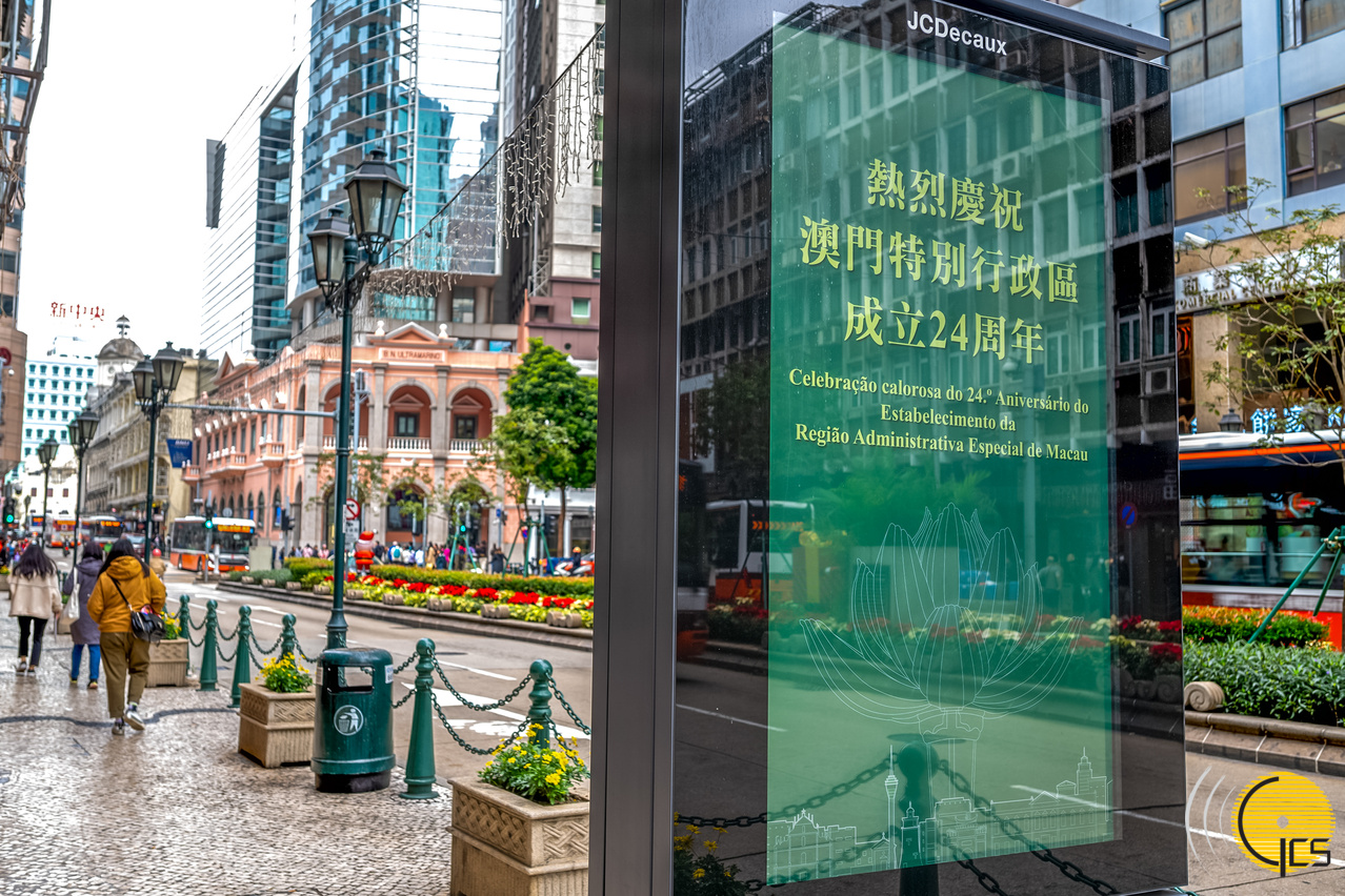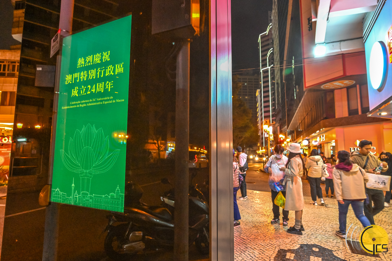 载有“热烈庆祝澳门特别行政区成立24周年”字句的电子海报随处可见。