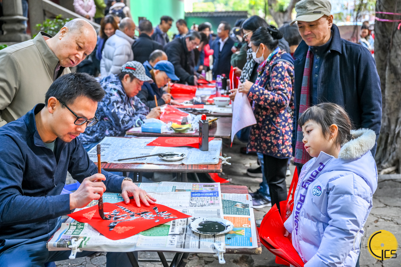 书画界人士写挥春送福,喜迎龙年,吸引大量居民驻足欣赏,随后把“福”带回家。
