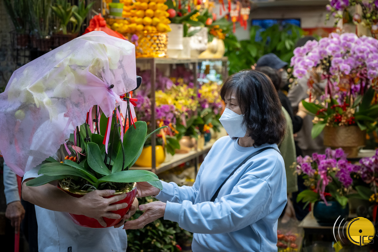 年宵市场售卖年花的摊檔深受欢迎,经过有居民前来挑选心头好。