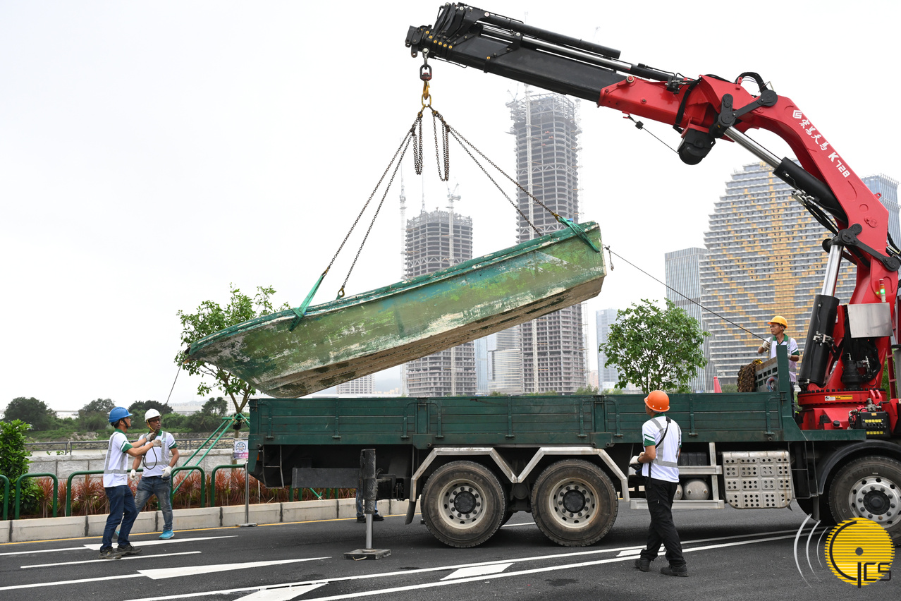 “水晶鱼2024”台风演习-一艘快艇被冲至岸上并翻侧在公共道路,治安警察局协调建筑工程公司派出工程车及人员到场移走快艇。