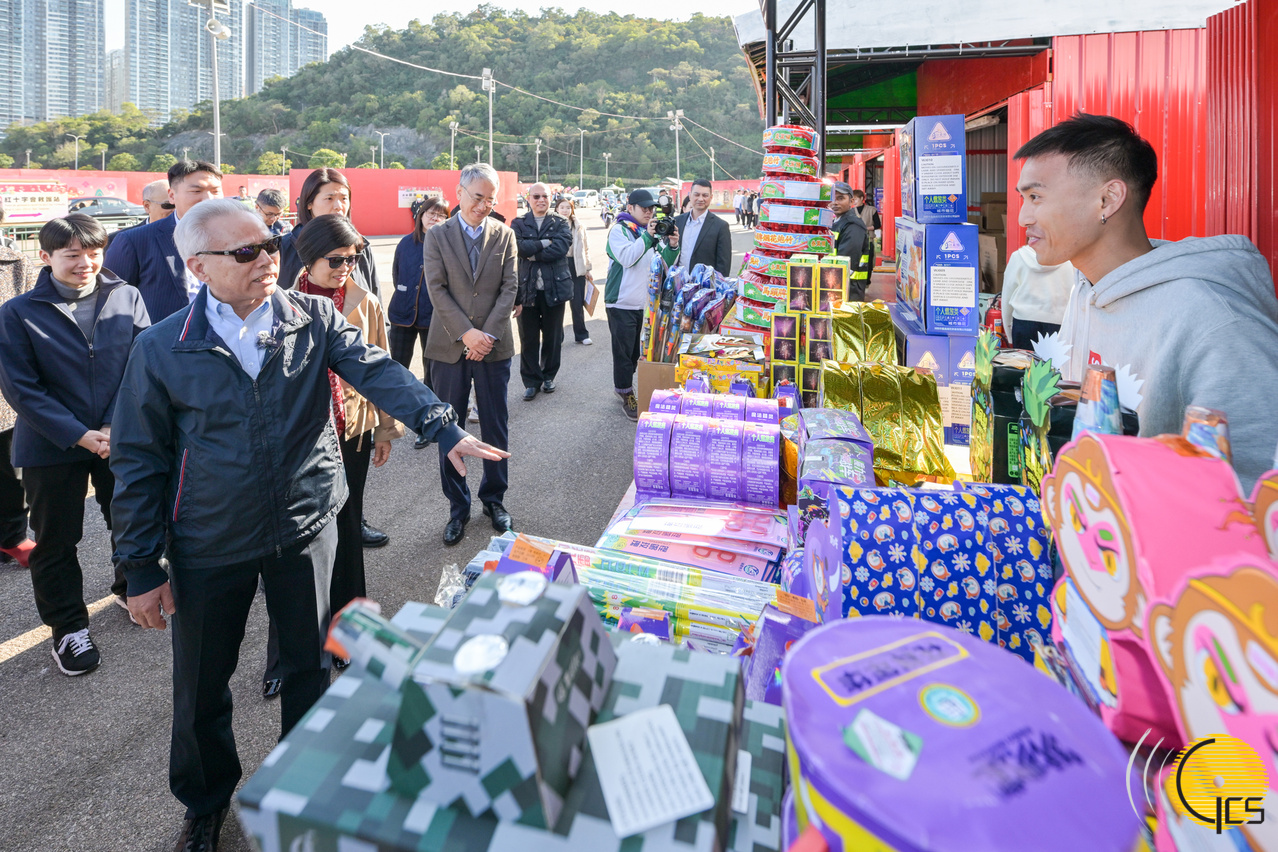 行政长官岑浩辉参观澳门区爆竹燃放区,与爆竹檔主亲切交谈,了解摊位营运准备,互相致以新春祝福。