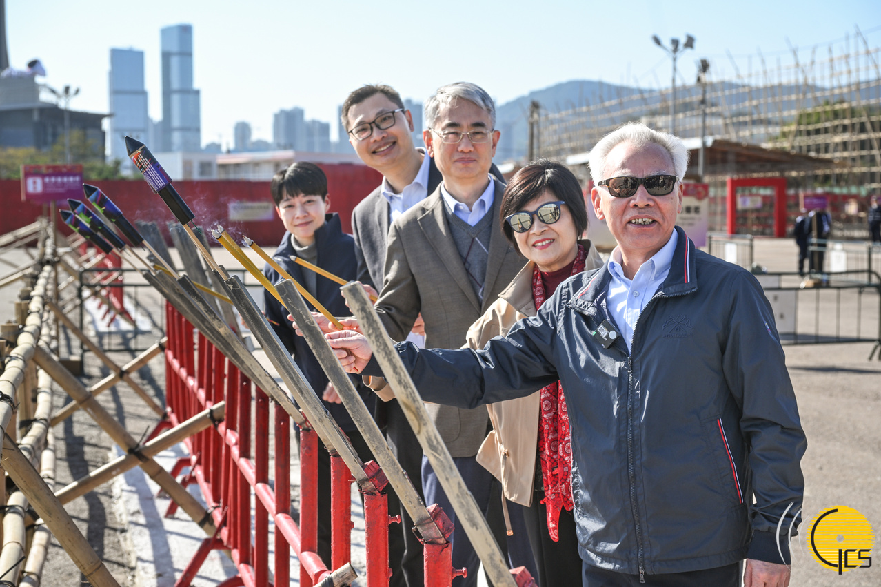 行政长官岑浩辉伉俪在澳门区爆竹燃放区燃放火箭,为大家送上新春祝福。