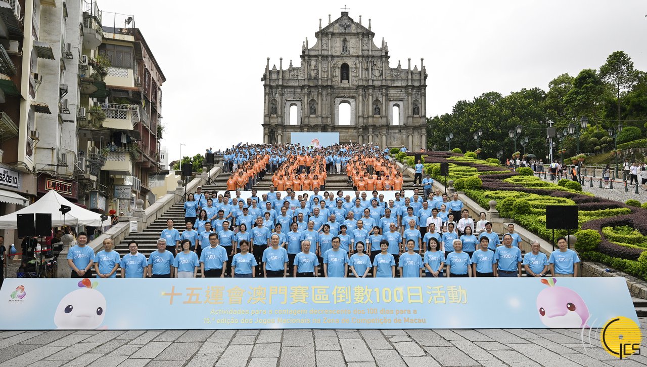 行政长官岑浩辉与十五运会澳门赛区倒数100日庆祝活动 - 迎百日健步行的参与者在大三巴牌坊合影。