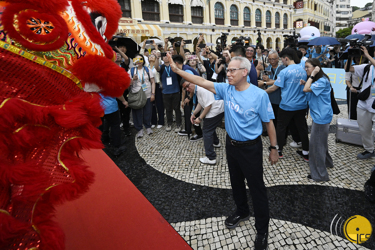 迎百日健步行活动至议事亭前地结束。行政长官岑浩辉向表演者挥手致意。