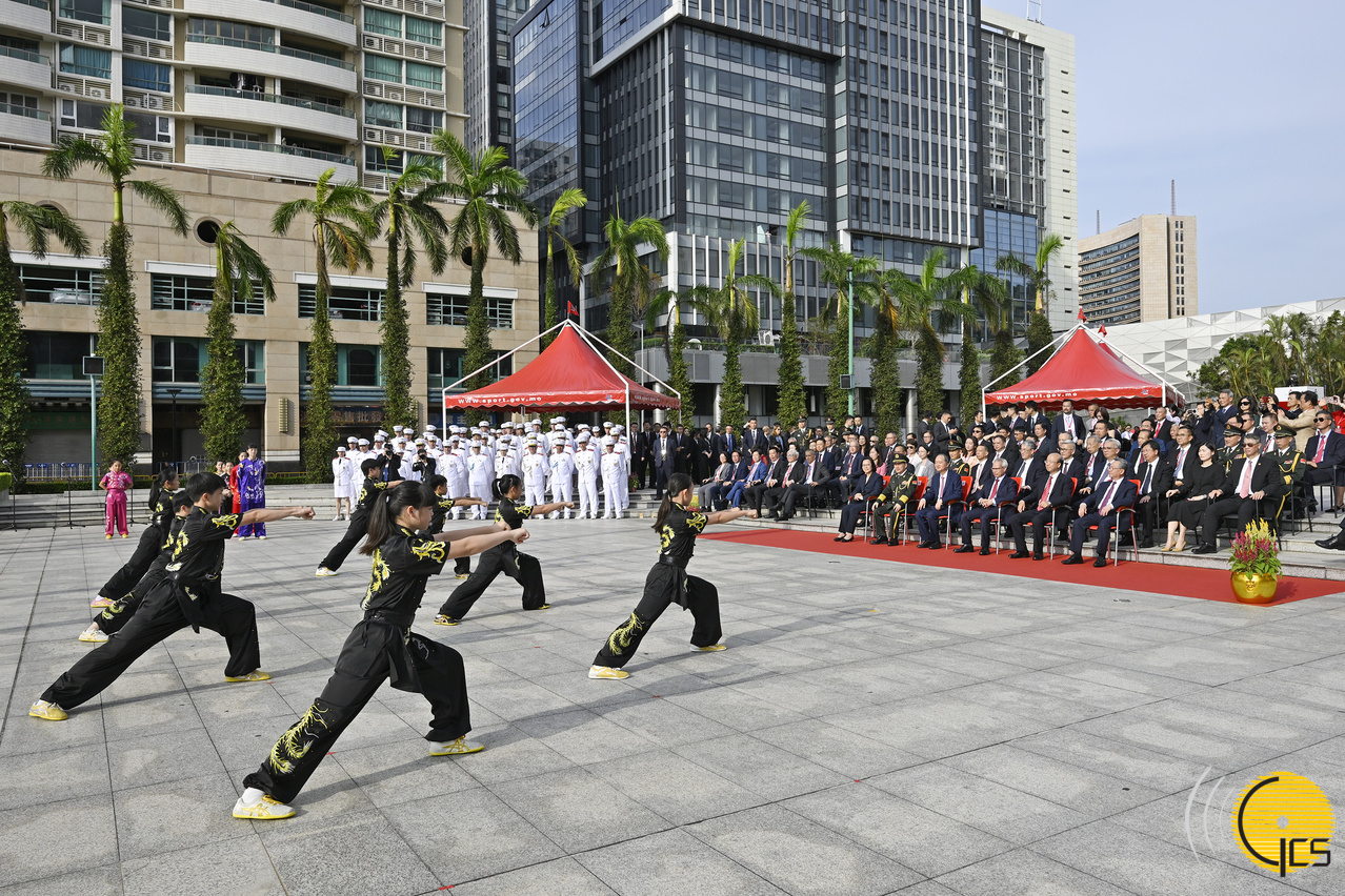 行政长官岑浩辉、中央驻澳官员、解放军驻澳部队军官、特区立法和司法机关负责人、政府主要官员及各界人士出席庆祝中华人民共和国成立76周年升旗仪式。