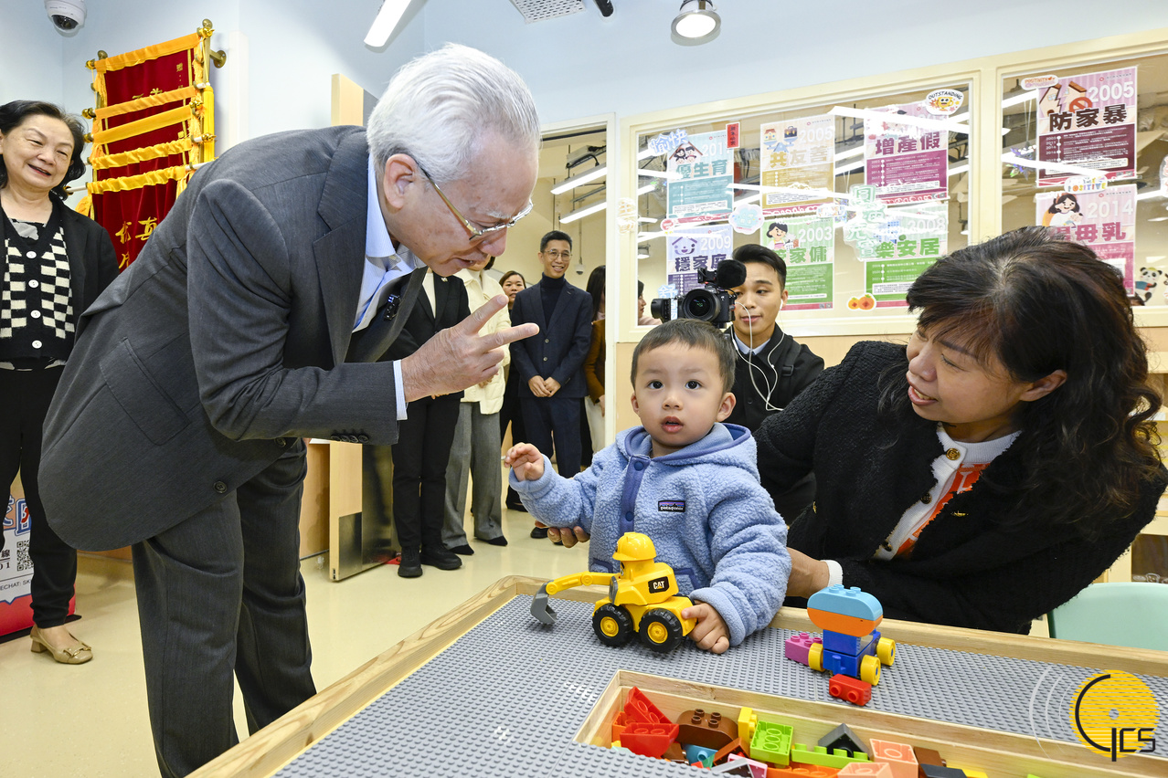 行政长官岑浩辉探访托儿所,与幼儿互动。