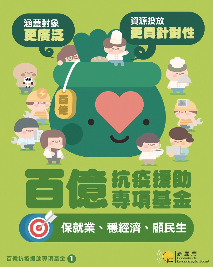因应疫情对澳门各行业及市民造成的经济影响,特区政府推出一系列纾困措施,除了提前于4月发放现金分享款项,还包括减免税费、支持信贷、鼓励消费等,涉及金额将近400亿元(澳门元,下同)。特区政府透过澳门基金会,设立一项规模为100亿元的抗疫援助专项基金,对受疫情影响而在生活或经营上有困难的澳门居民和企业商户提供援助,以及对防疫抗疫工作给予财政上更有力、更快捷的支持,务求做到急市民所急,稳定澳门经济,保障民生就业。